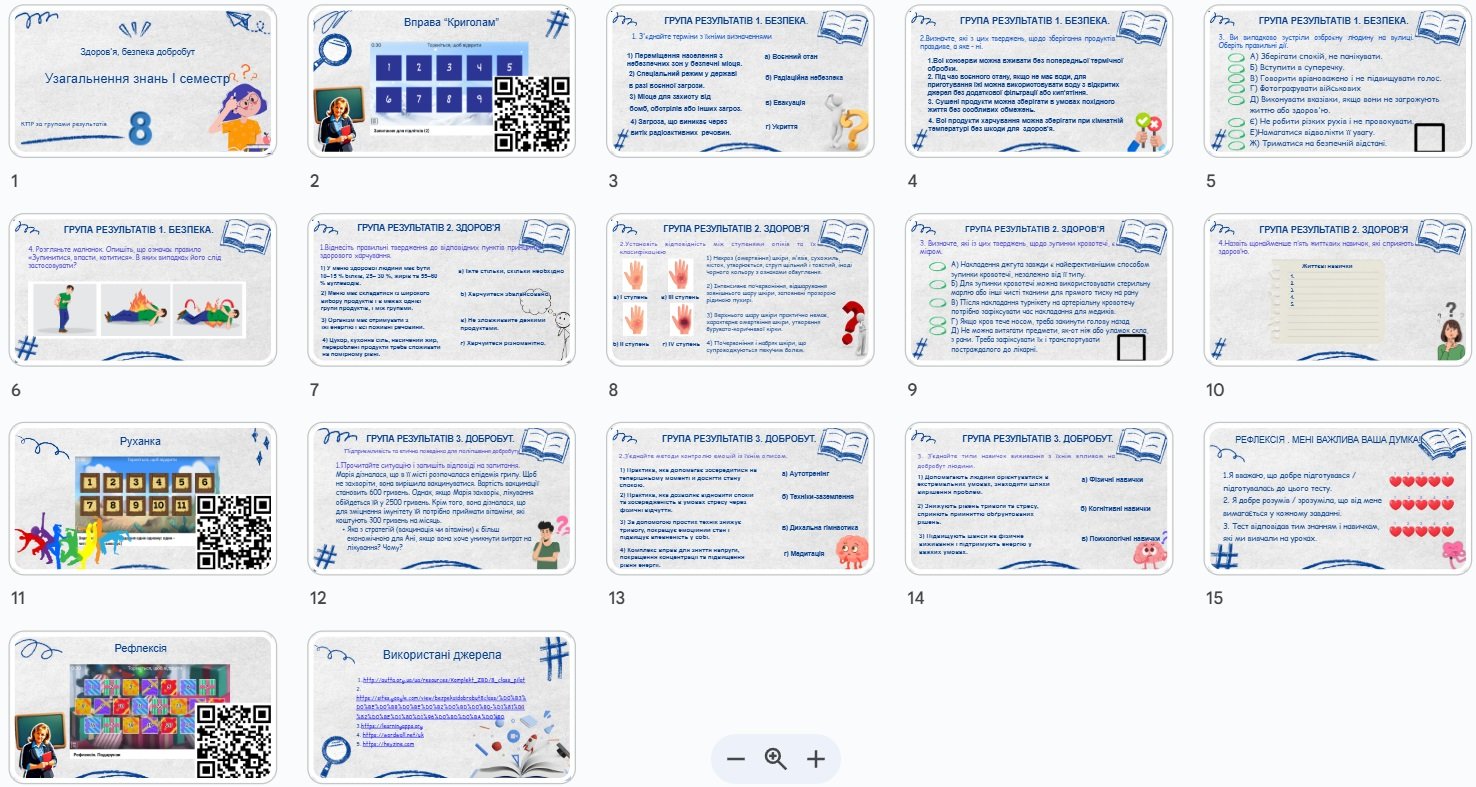 Презентація містить КПР за групами результатів за підручником Воронцова Т.В. “Здоров’я, безпека та добробут” 8 клас 2025 року, є посилання на інтерактивні вправи для мотивації та узагальнення знань. Може бути використана як для очного так і для дистанційного навчання.
