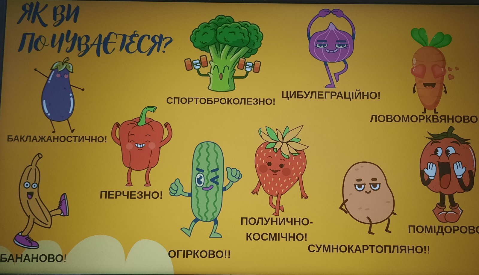 Урок розпочинається яскравими слайдами-емоціями, де учні обирають, як вони почуваються (“бананово”, “огірково”, “спорто-броколезно” тощо). Такий прийом налаштовує їх на позитивний навчальний настрій. -