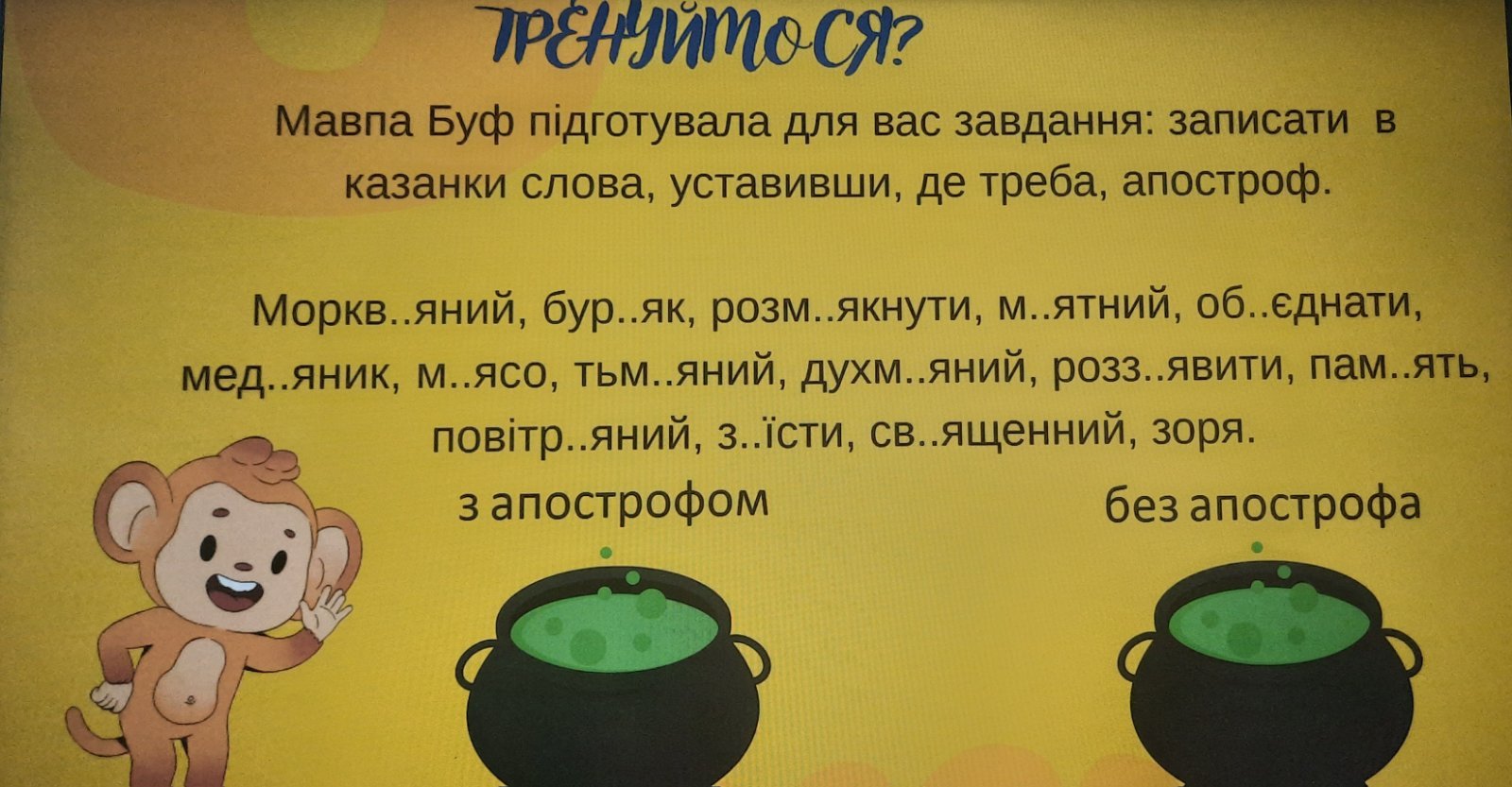 Мавпа Буф пропонує вправу «записати в казанки слова, вставивши апостроф»: