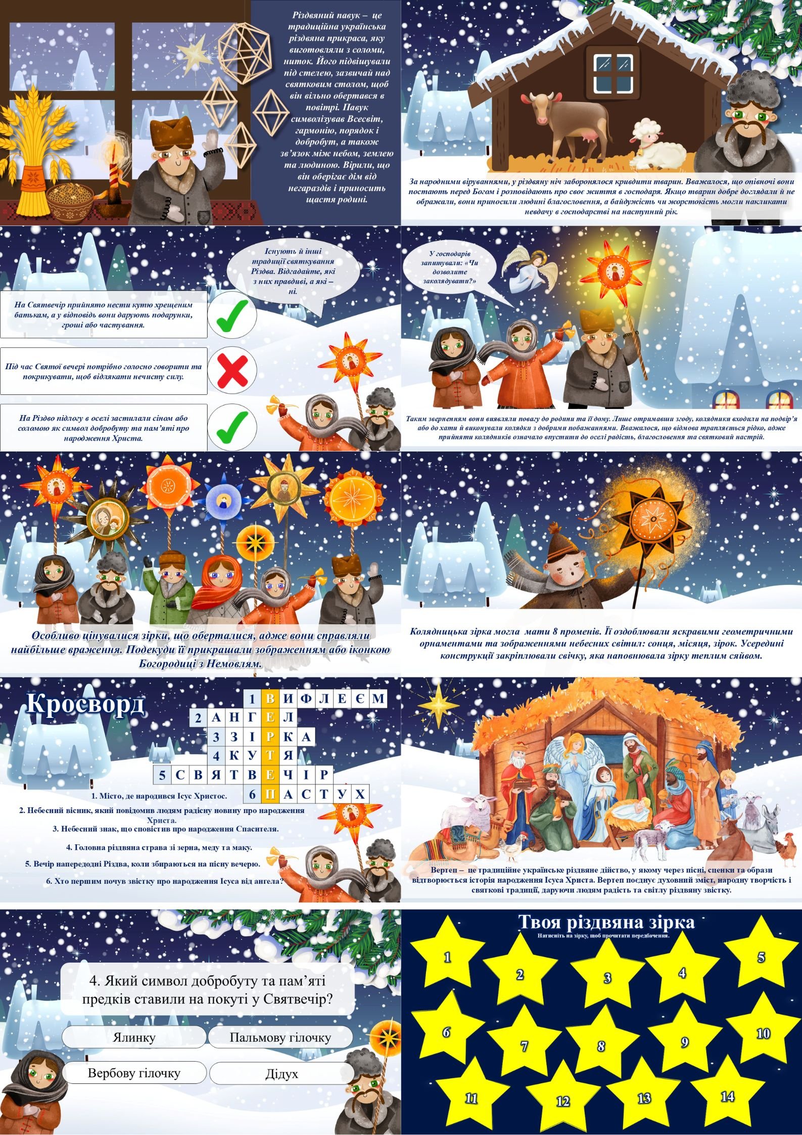 Презентація «Різдво в Україні» до Різдва Христового допоможе доступно розповісти учням про історію свята, традиції його святкування в Україні, різдвяні символи, колядування та учасників колядницьких гуртів. Матеріал містить загадки, кросворд, вікторину та інші активності. Презентацію можна використати в роботі з учнями 2–9 класів.