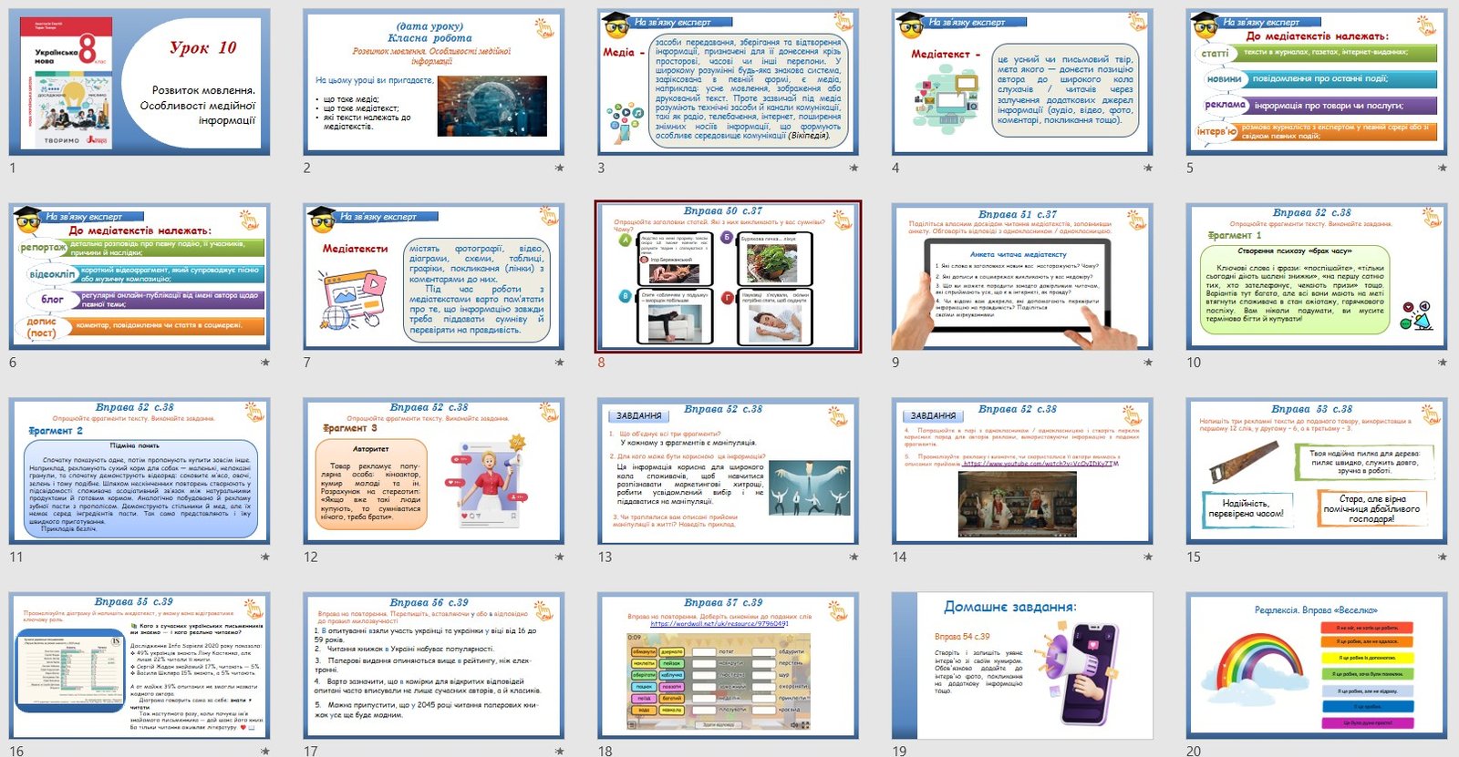 Презентація з української мови для 8 класу НУШ до уроку 10 на тему “Розвиток мовлення. Особливості медійної інформації” містить матеріал, вправи і завдання за підручником Українська мова: підручник для 8 класу закладів загальної середньої освіти/А. В. Онатій, Т. П. Ткачук, 2025.