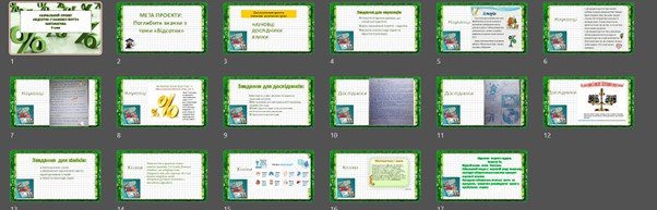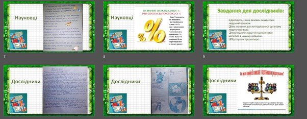 Навчальний проєкт з математики 5 клас. Мета цього проєкту поглибити знання з теми “Відсотки”. Для підготовки проєкту учні діляться на три групи: “Науковці”, “Дослідники”, “Хіміки”. Завдання для “Науковців”: 1) Навести історичну довідку; 2) Дати визначення поняття “відсотку”. Завдання для “Дослідників”: 1)Дослідити, з яких речовин складається людський організм; 2)Яке значення для життєдіяльності організму людини має вода; 3)Який відсоток води та інших речовин міститься в нашому організмі. Завдання для “Хіміків”: 1) Визначити відсотковий вміст однієї речовини в іншій .