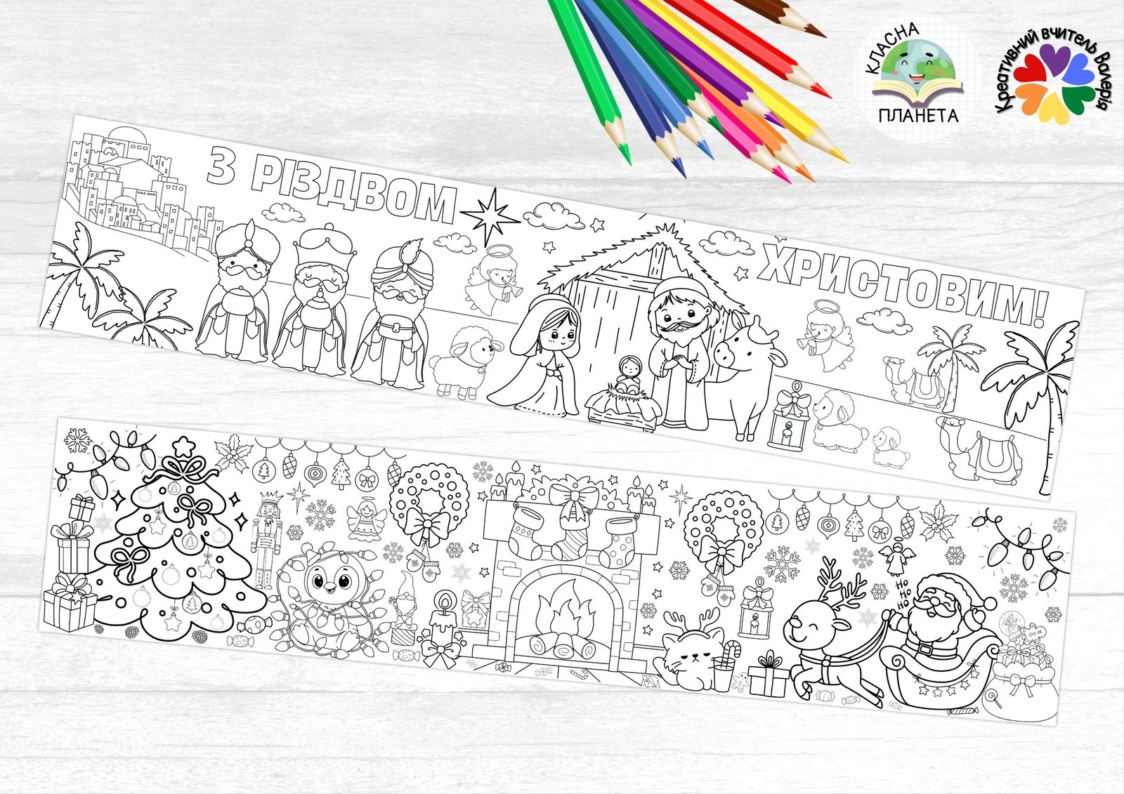 Матеріал містить дві різдвяні розмальовки. Кожна розмальовка поділена на 6 аркушів А4.