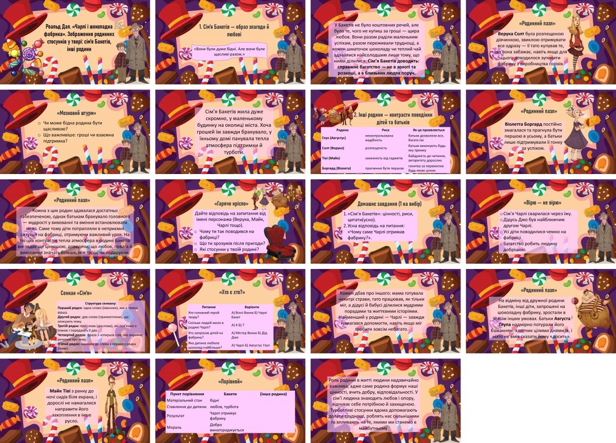Роальд Дал «Чарлі і шоколадна фабрика». Зображення родинних стосунків у творі: сім’я Бакетів, інші родини