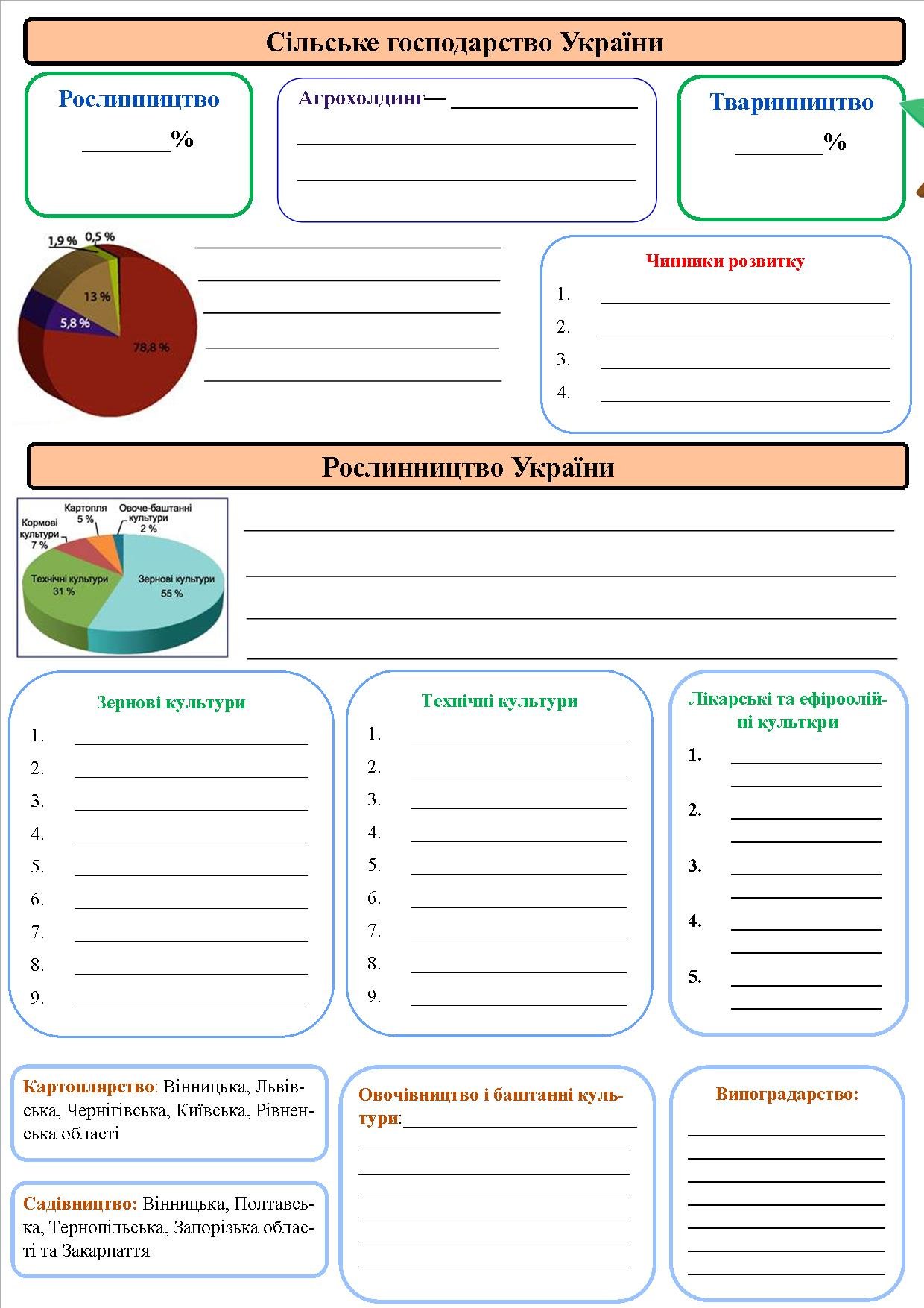 За допомогою робочих аркушів “Рослинництво України. Тваринництво України. Лісове господарство України і світу” можна якісно та наглядно опрацювати відповідні теми. Дані аркуші підійдуть до будь якого підручника з географії для 9 класу.
