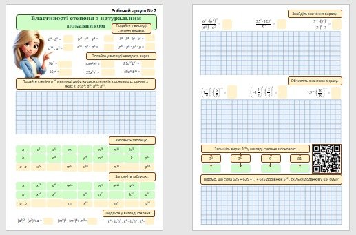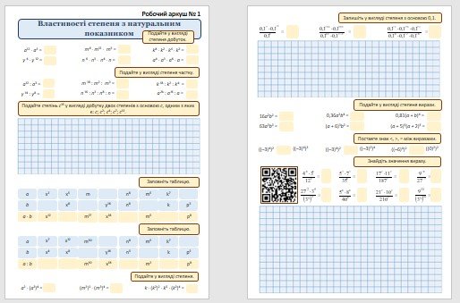 Робочі аркуші з алгебри для учнів 7 класу з теми “Степінь з натуральним показником”