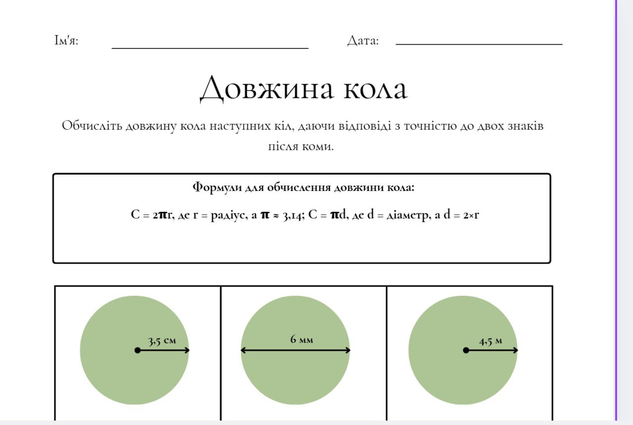 Матеріали «Робочий листок Довжина кола» будуть надіслані в електронному вигляді на вашу поштову скриньку одразу після оплати.