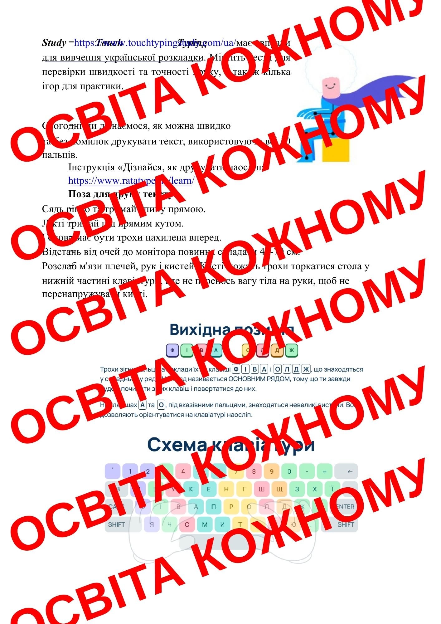 Теоретична база: Наочні схеми будови клавіатури, правила правильної посадки за комп’ютером, постановка рук на основний ряд (ФІВА-ОЛДЖ) та техніка руху пальців .