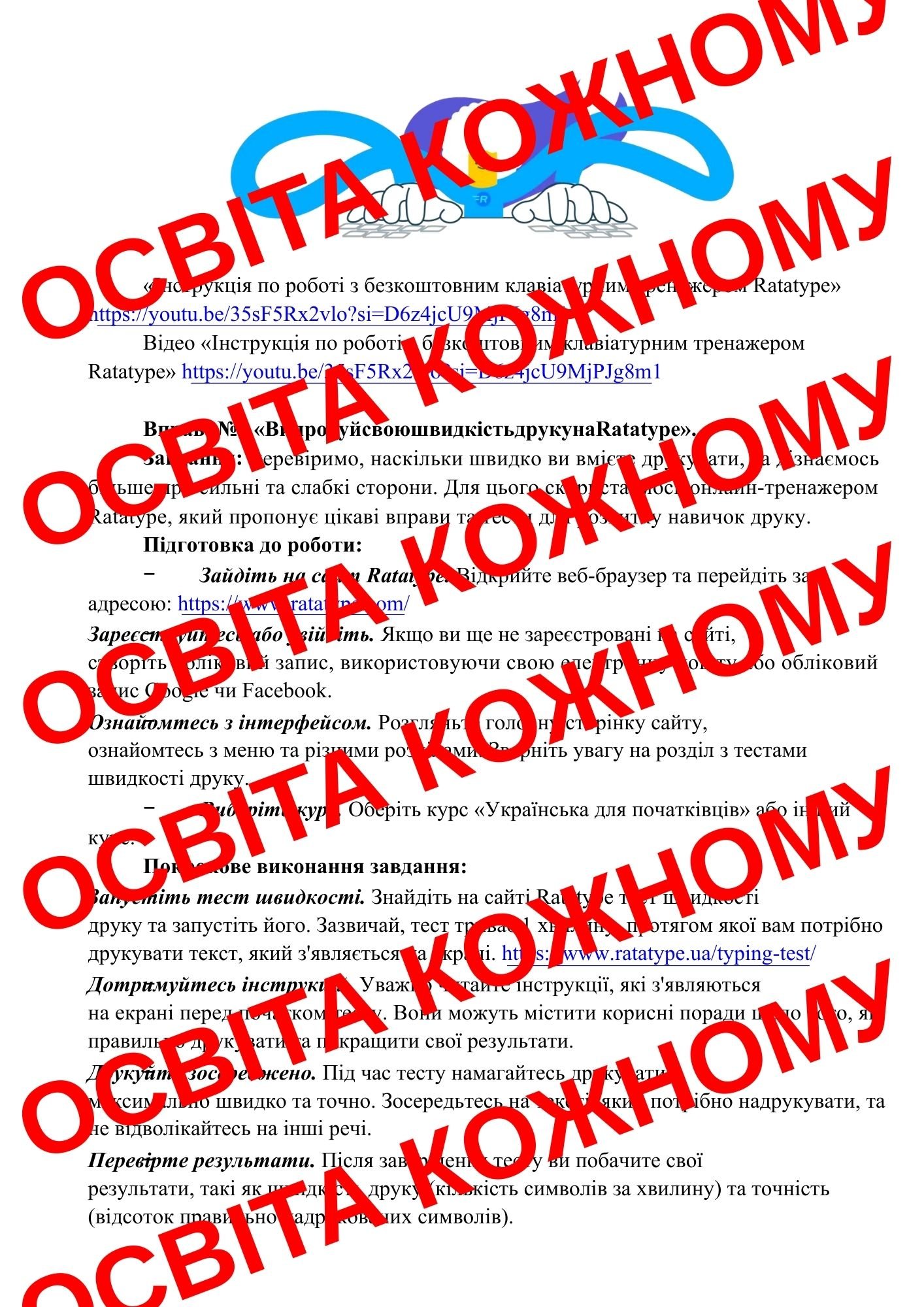 Покрокові практичні вправи: Детальні інструкції для роботи в Ratatype, включаючи перевірку базової швидкості, набір текстів українських пісень та участь в азартному онлайн-змаганні «Перегони на клавіатурі» .