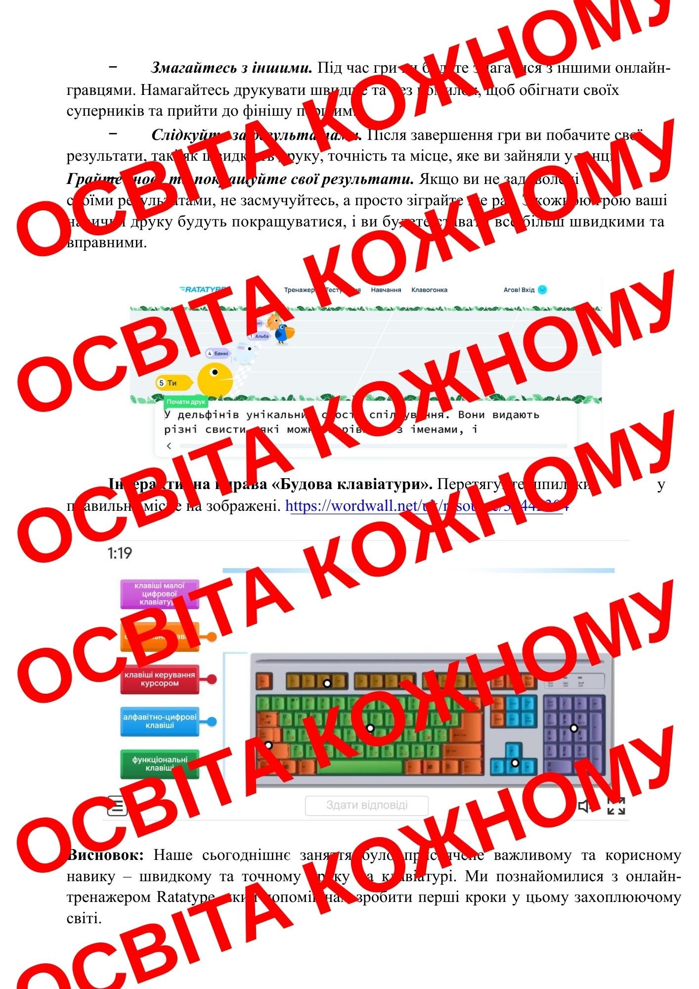 Інтерактивні матеріали: Готові покликання на навчальні відеоролики та закріплюючу вправу на платформі Wordwall для вивчення зон клавіатури .