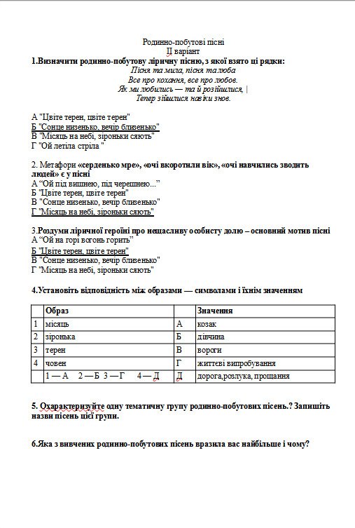 Родинно-побутові пісні. 9 КЛАС.(тести + завдання відкритої форми)