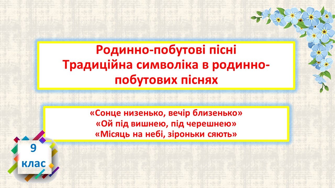 Коли я отримаю матеріал «Родинно-побутові пісні. Традиційна символіка. «Сонце низенько, вечір близенько» «Ой під вишнею, під черешнею» «Місяць на небі, зіроньки сяють»»?