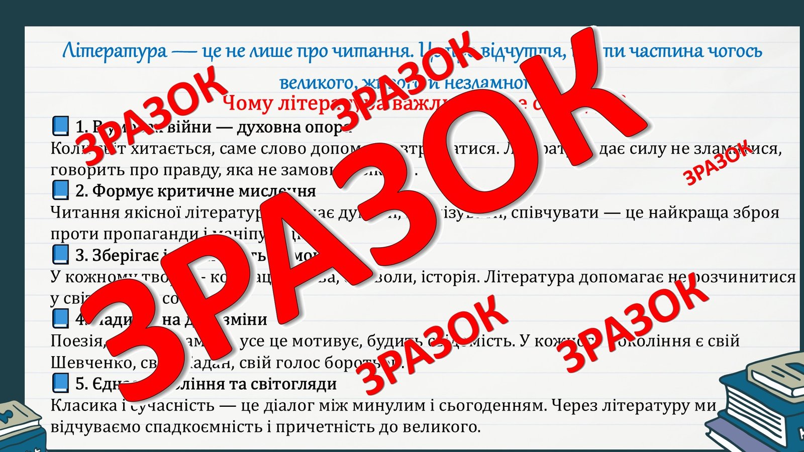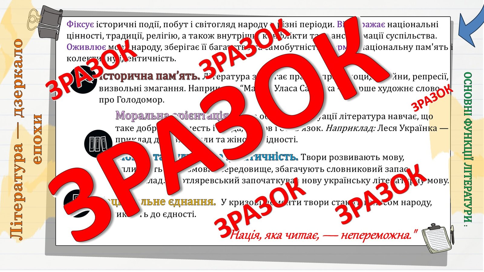 Матеріали «РОЛЬ І МІСЦЕ ЛІТЕРАТУРИ В ЖИТТІ НАЦІЇ. РОЗВИТОК ЛІТЕРАТУРИ.» будуть надіслані в електронному вигляді на вашу поштову скриньку одразу після оплати.