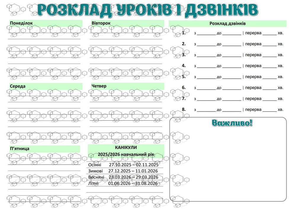 Матеріали «!!! РОЗКЛАД УРОКІВ І ДЗВІНКІВ + КАЛЕНДАР УЧИТЕЛЯ на 2025-2026 НАВЧАЛЬНИЙ РІК . ПЛАН НА ДЕНЬ.» будуть надіслані в електронному вигляді на вашу поштову скриньку одразу після оплати.