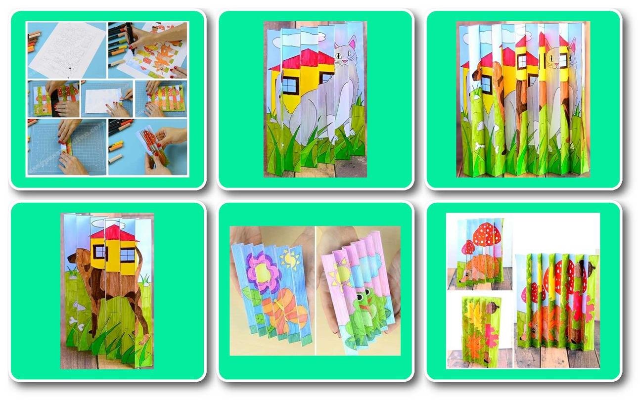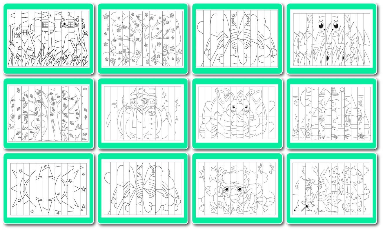 У комплекті зразки та шаблони для розфарбовування 13 шт. (формат А4): яскрава осінь, їжачок, веселка, сніговик, листопад, риби, жаба та ін. Створюємо власний анімований малюнок! Агамограф — коли один малюнок ховає в собі два!