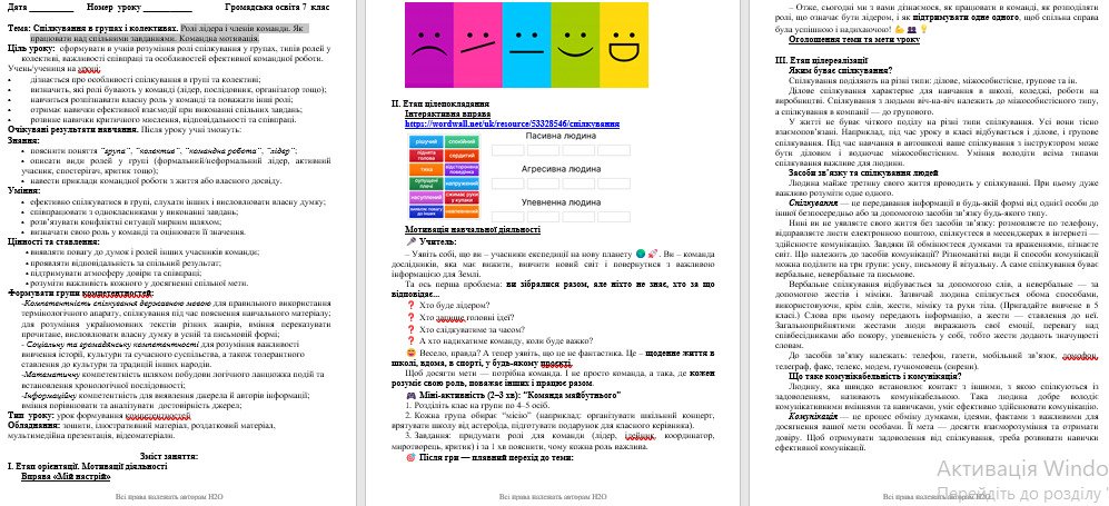 Розробка урока Громадська освіта 7 клас. Тема:Спілкування в групах і колективах. Ролі лідера і членів команди. Як працювати над спільними завданнями. Командна мотивація.