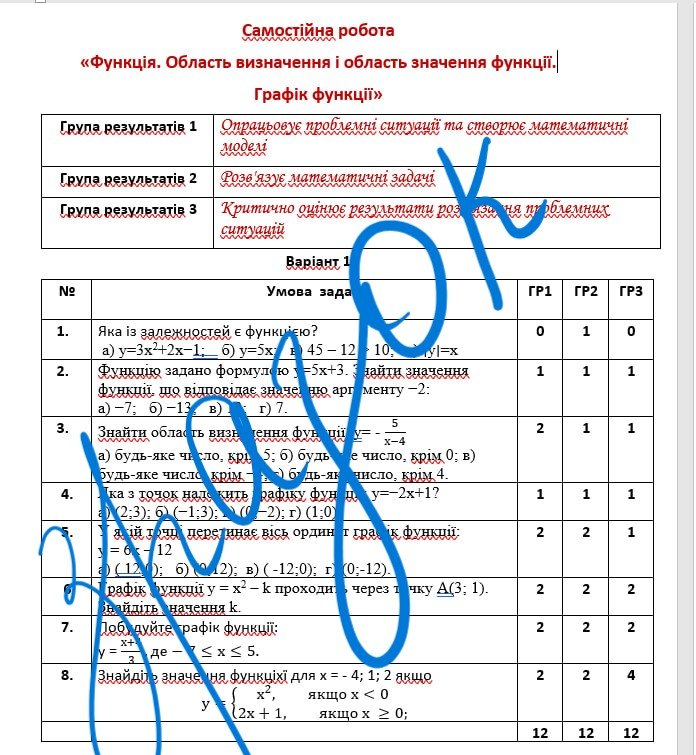 Самостійна робота за групами результатів з алгебри 7 клас “Функція. Область визначення і область значення функції.Графік функції” з відповідями за програмою Н.Тарасенкової