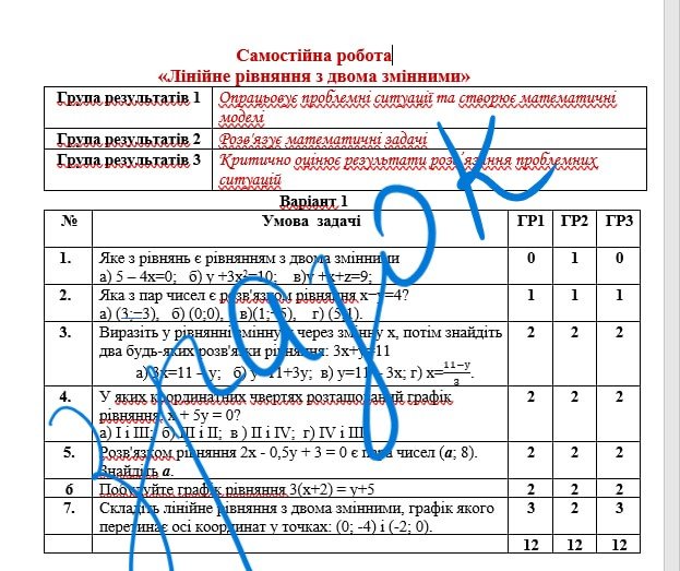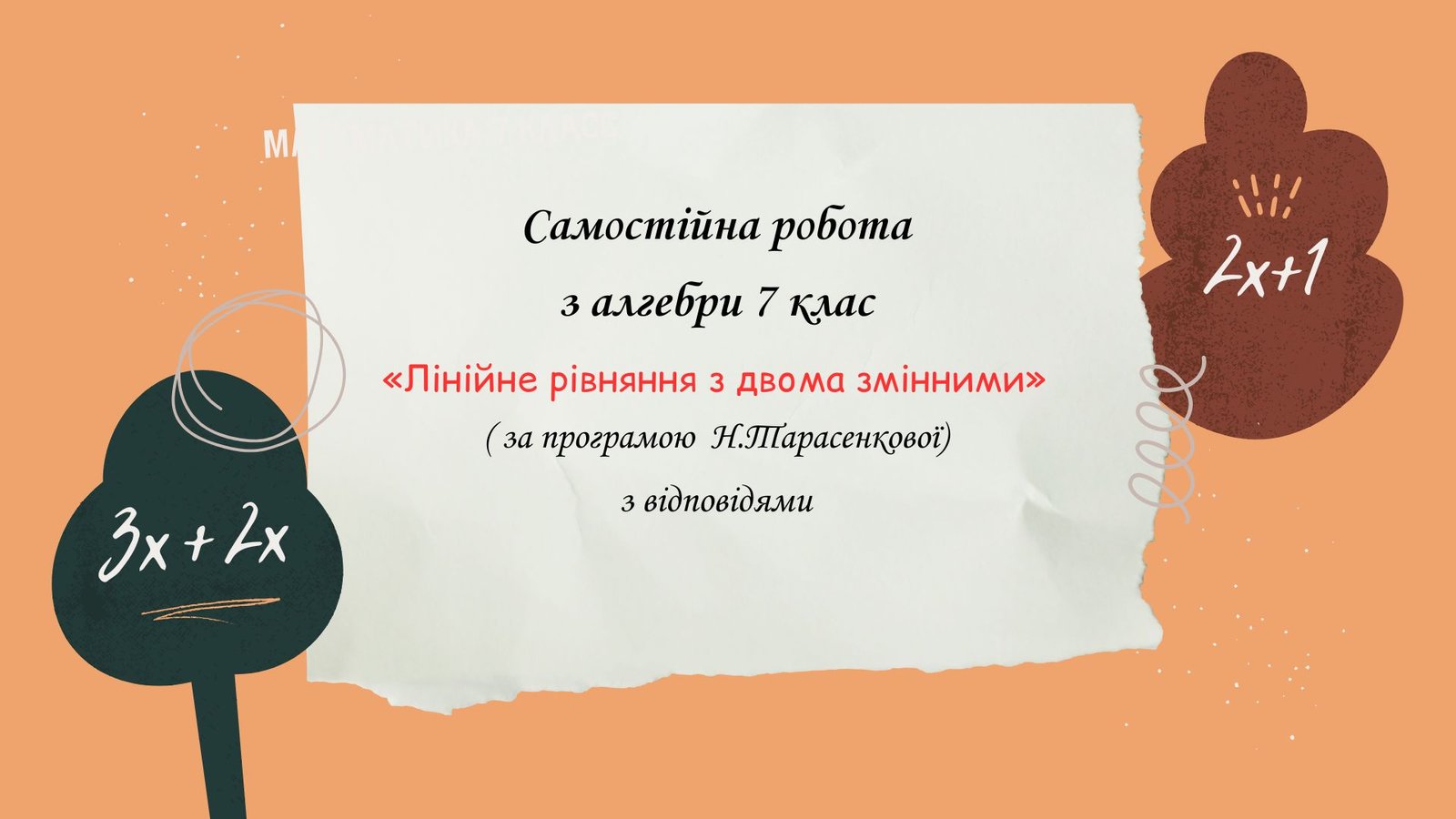 Самостійна робота за групами результатів з алгебри 7 клас «Лінійне рівняння з двома змінними» з відповідями за програмою Н.Тарасенкової