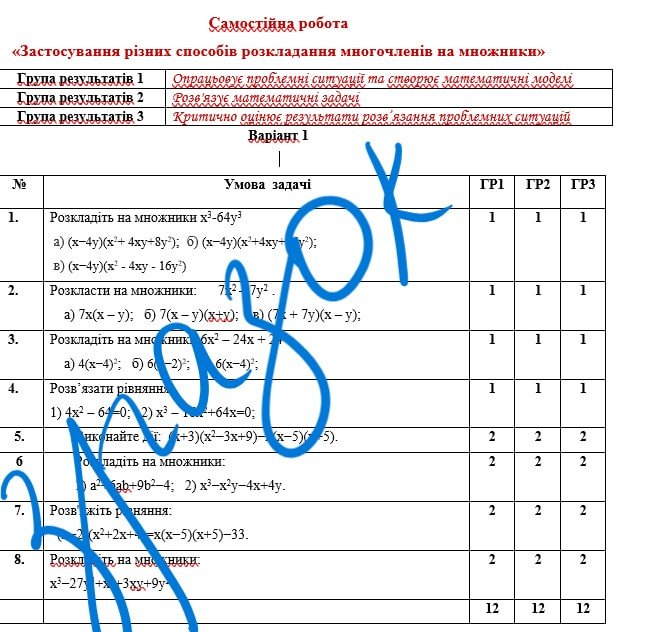 Самостійна робота за групами результатів з алгебри 7 клас «Застосування різних способів розкладання многочленів на множники» з відповідями за програмою О.Істера