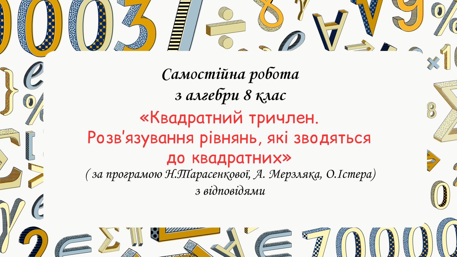 Самостійна робота за групами результатів з алгебри 8 клас “Квадратний тричлен. Розв’язування рівнянь, які зводяться до квадратних” з відповідями за програмою О.Істера, Н.Тарасенкової, А. Мерзляка