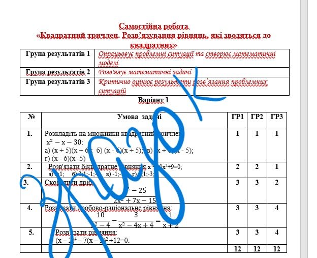 Самостійна робота за групами результатів з алгебри 8 клас “Квадратний тричлен. Розв’язування рівнянь, які зводяться до квадратних”