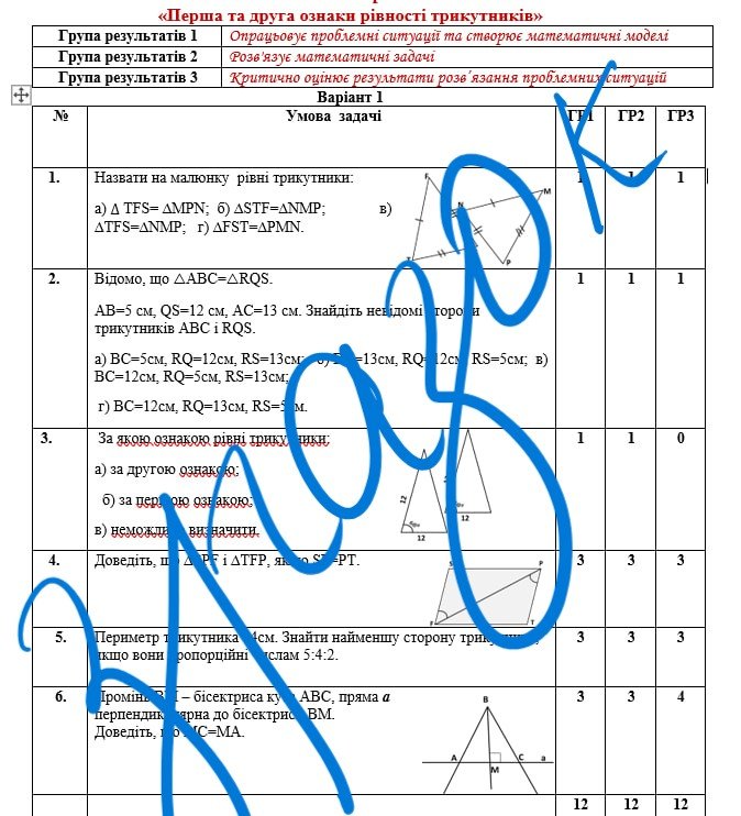 Самостійна робота за групами результатів з геометрії 7 клас «Перша та друга ознаки рівності трикутників»