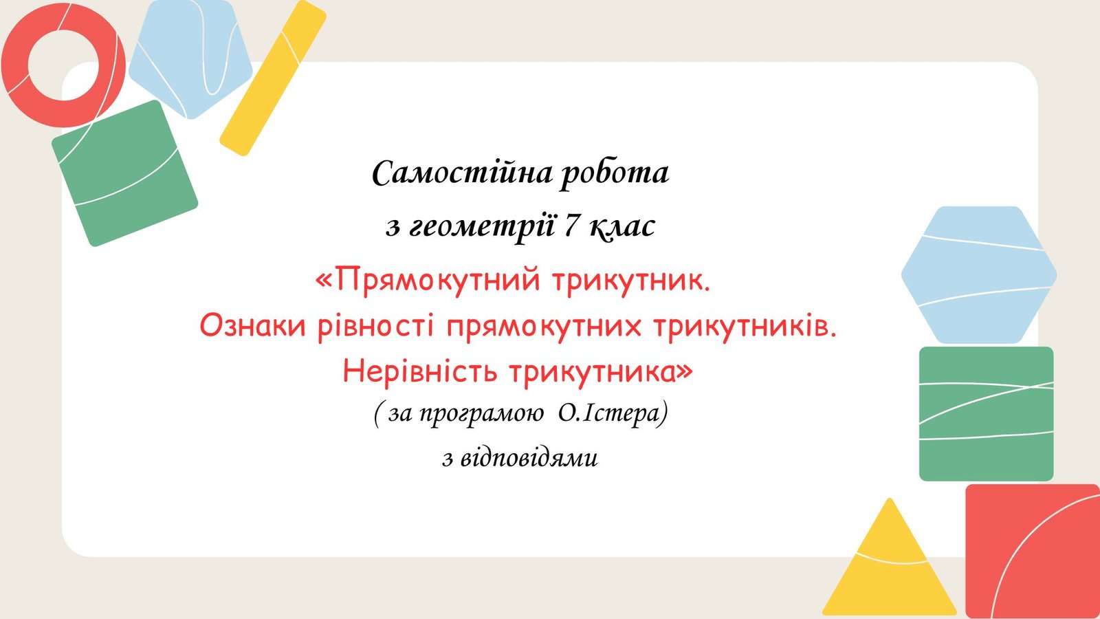 Самостійна робота за групами результатів з геометрії 7 клас «Прямокутний трикутник. Ознаки рівності прямокутних трикутників. Нерівність трикутника» з відповідями за програмою О.Істера