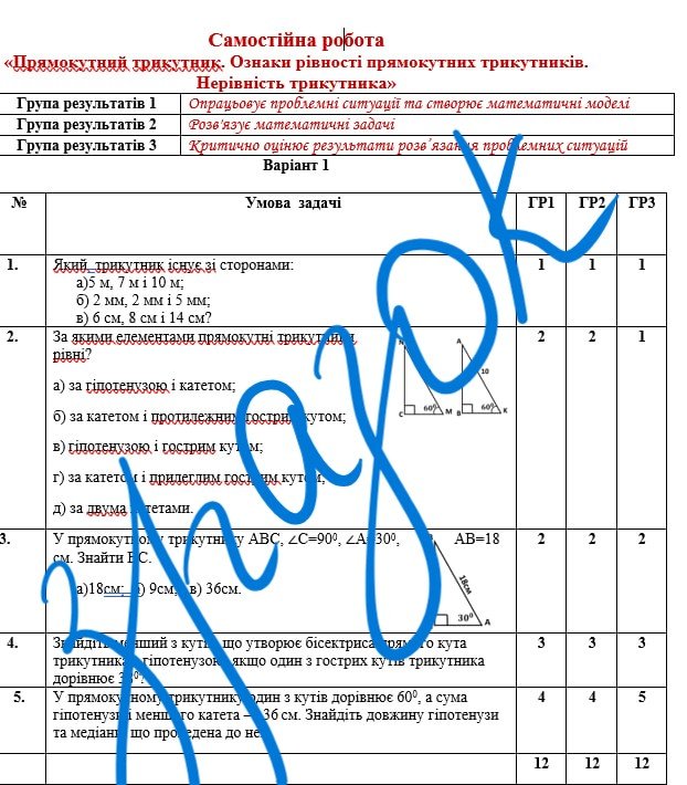 Самостійна робота за групами результатів з геометрії 7 клас «Прямокутний трикутник. Ознаки рівності прямокутних трикутників. Нерівність трикутника»