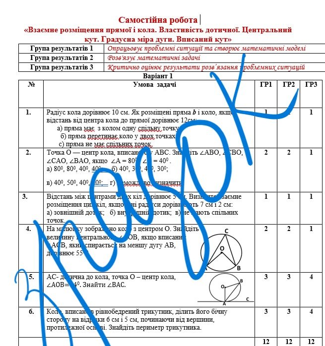 Самостійна робота за групами результатів з геометрії 7 клас «Взаємне розміщення прямої і кола. Властивість дотичної. Центральний кут. Градусна міра дуги. Вписаний кут» з відповідями за програмою О.Істера