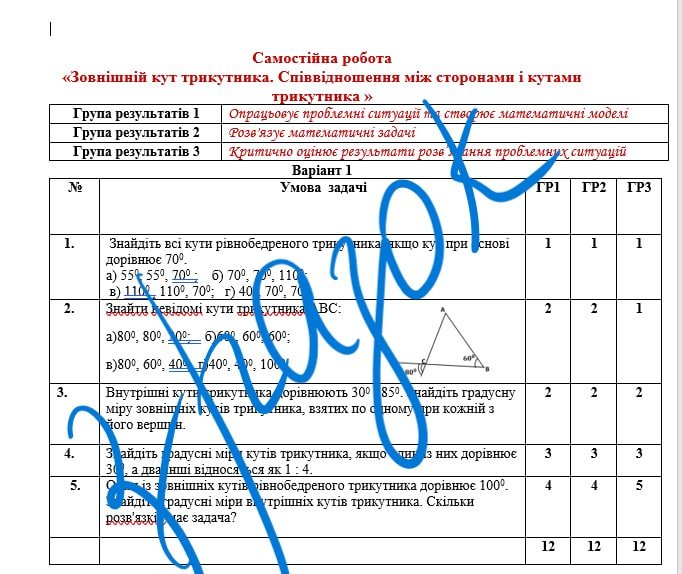 Самостійна робота за групами результатів з геометрії 7 клас «Зовнішній кут трикутника. Співвідношення між сторонами і кутами трикутника» з відповідями за програмою О.Істера