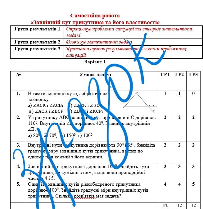 Самостійна робота за групами результатів з геометрії 7 клас «Зовнішній кут трикутника та його властивості»