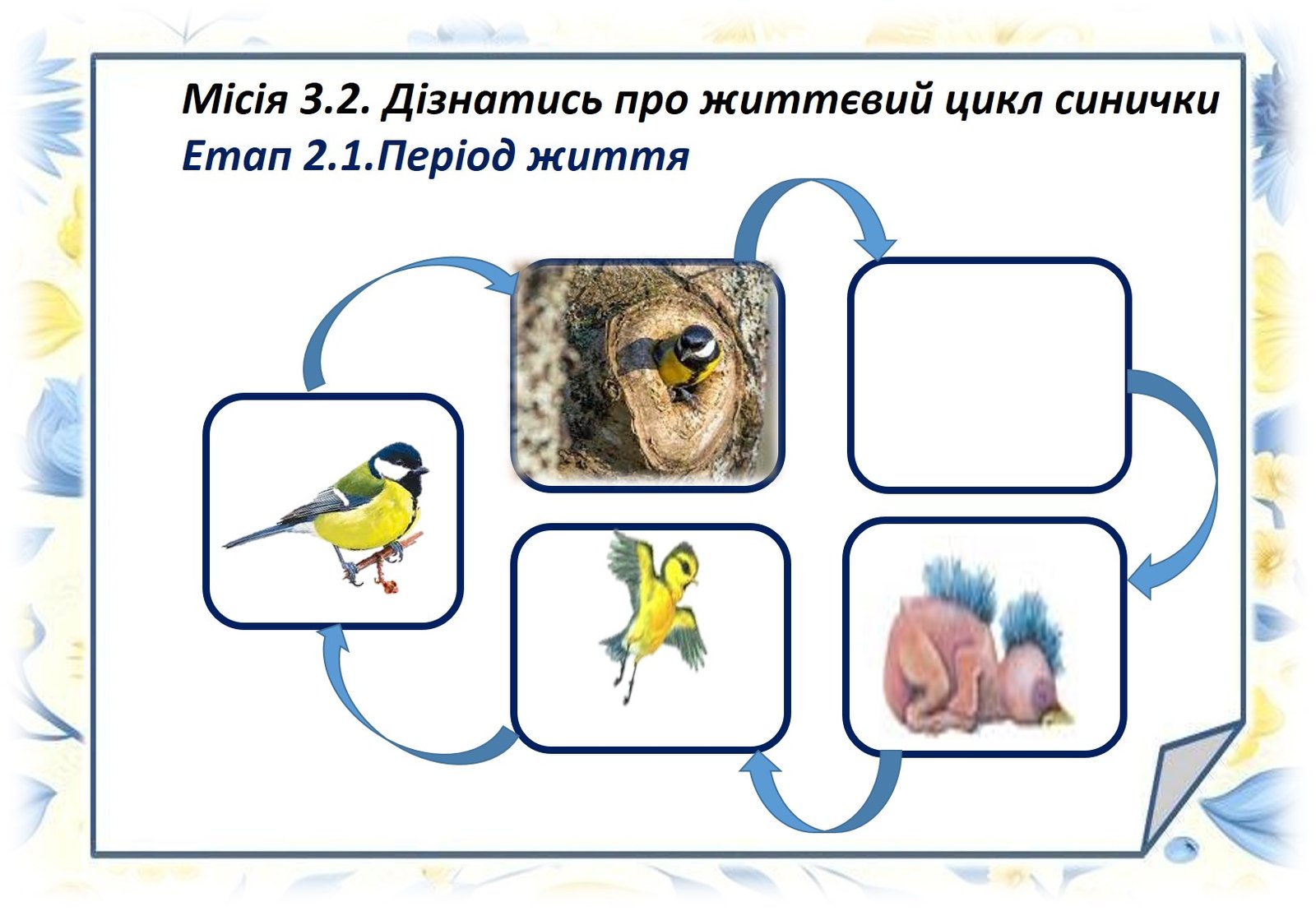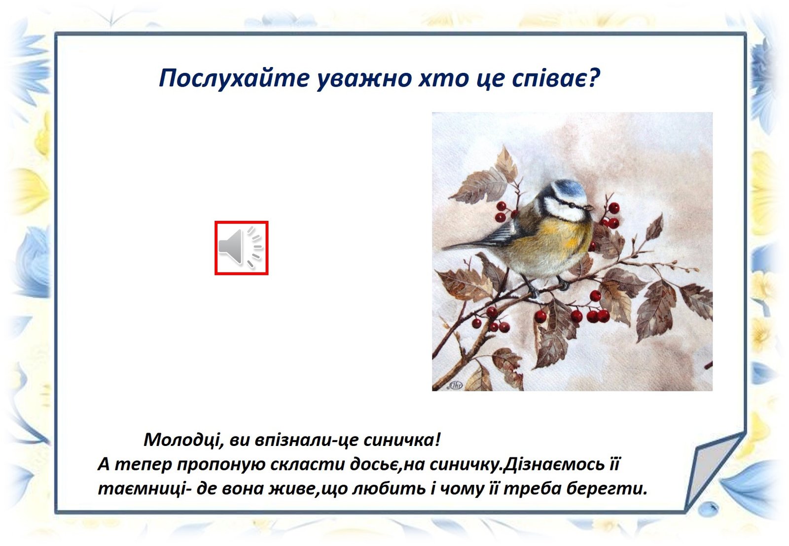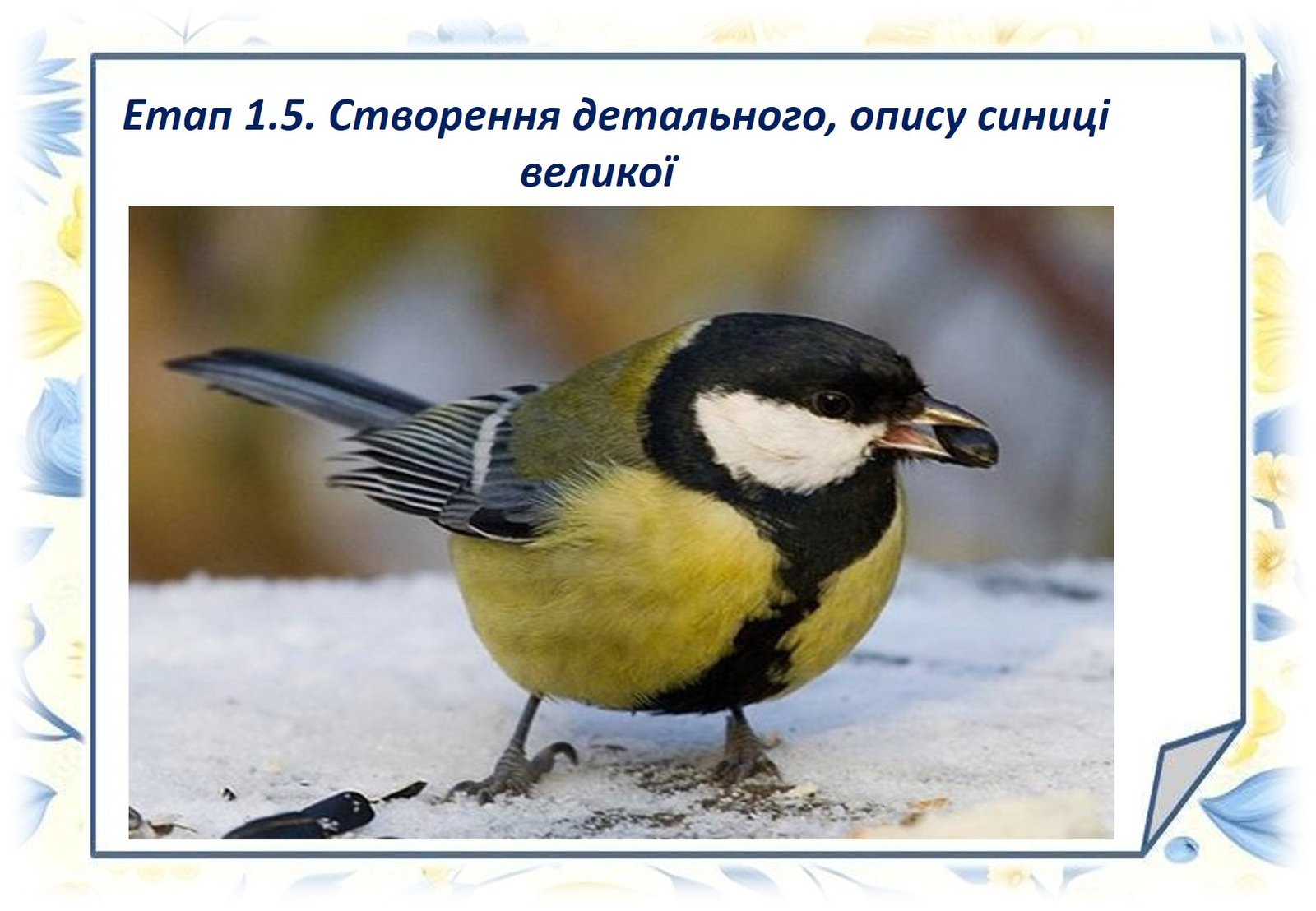 Мета: розширити знання дітей про пташку велику синичку, відкривати таємниці навколишнього світу. Розвивати творчі здібності дітей Виховувати турботливе ставлення до птахів; вчити оберігати і захищати птахів.