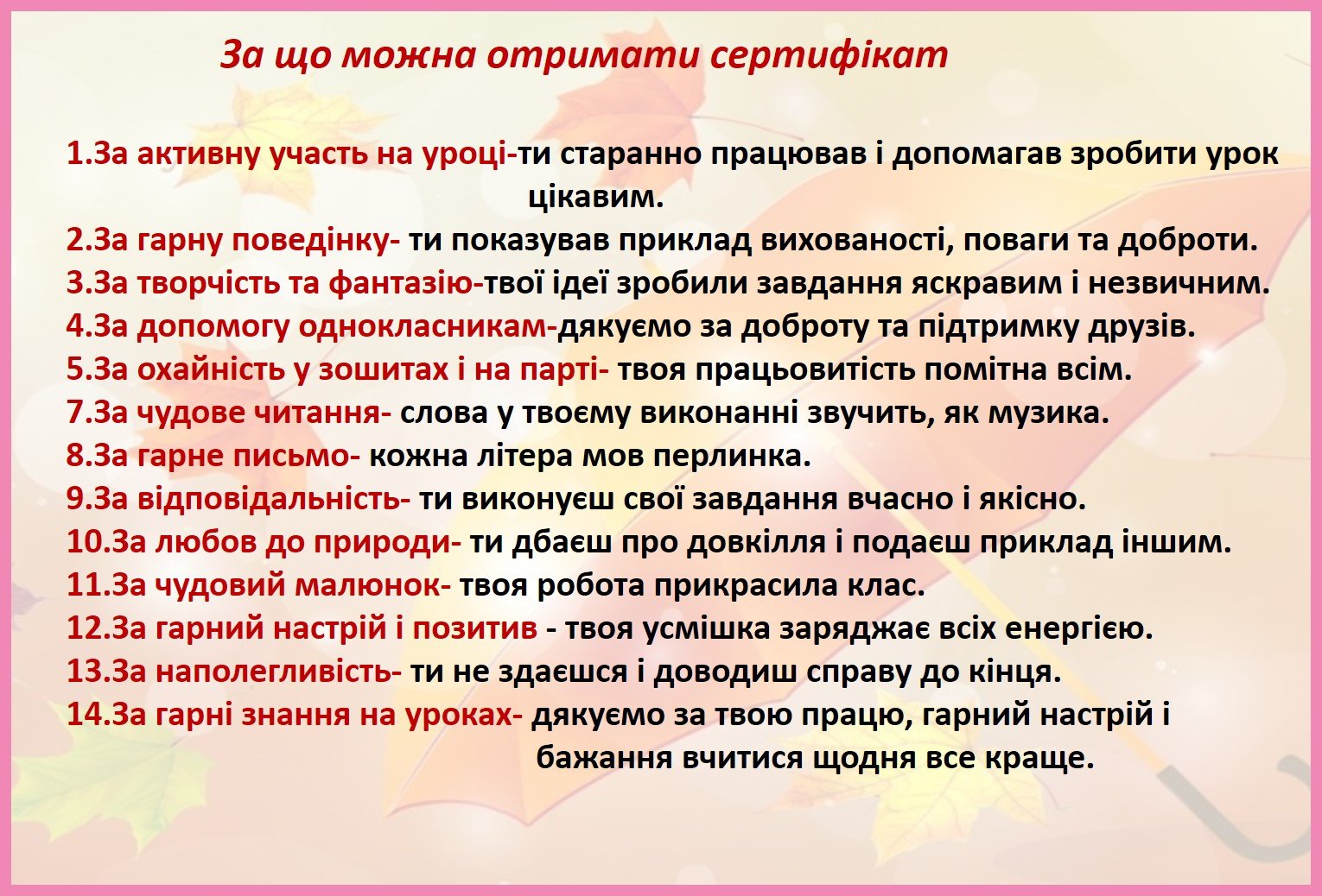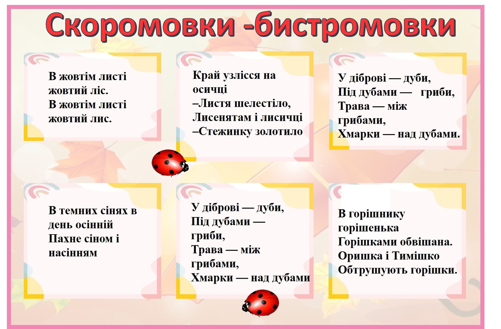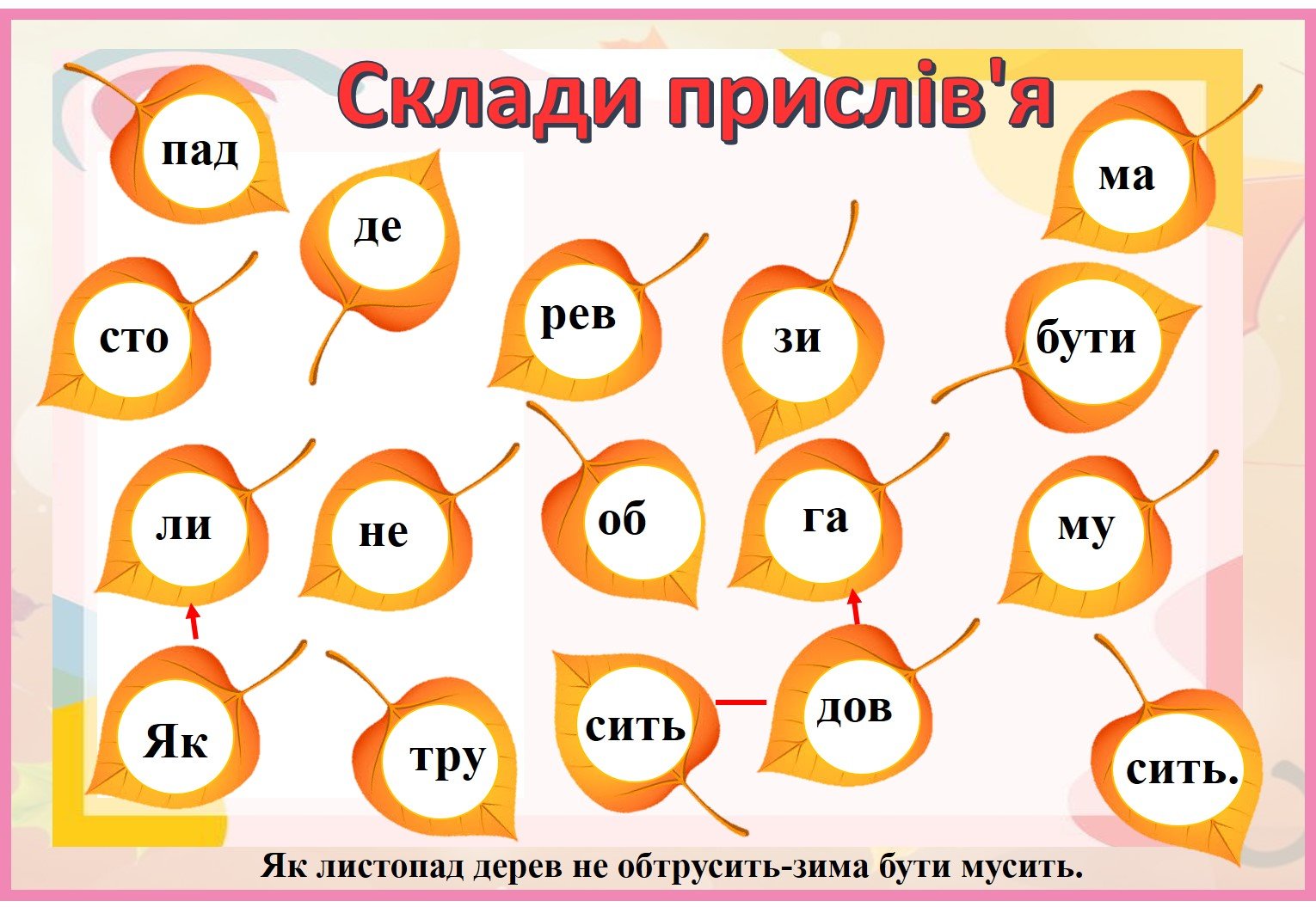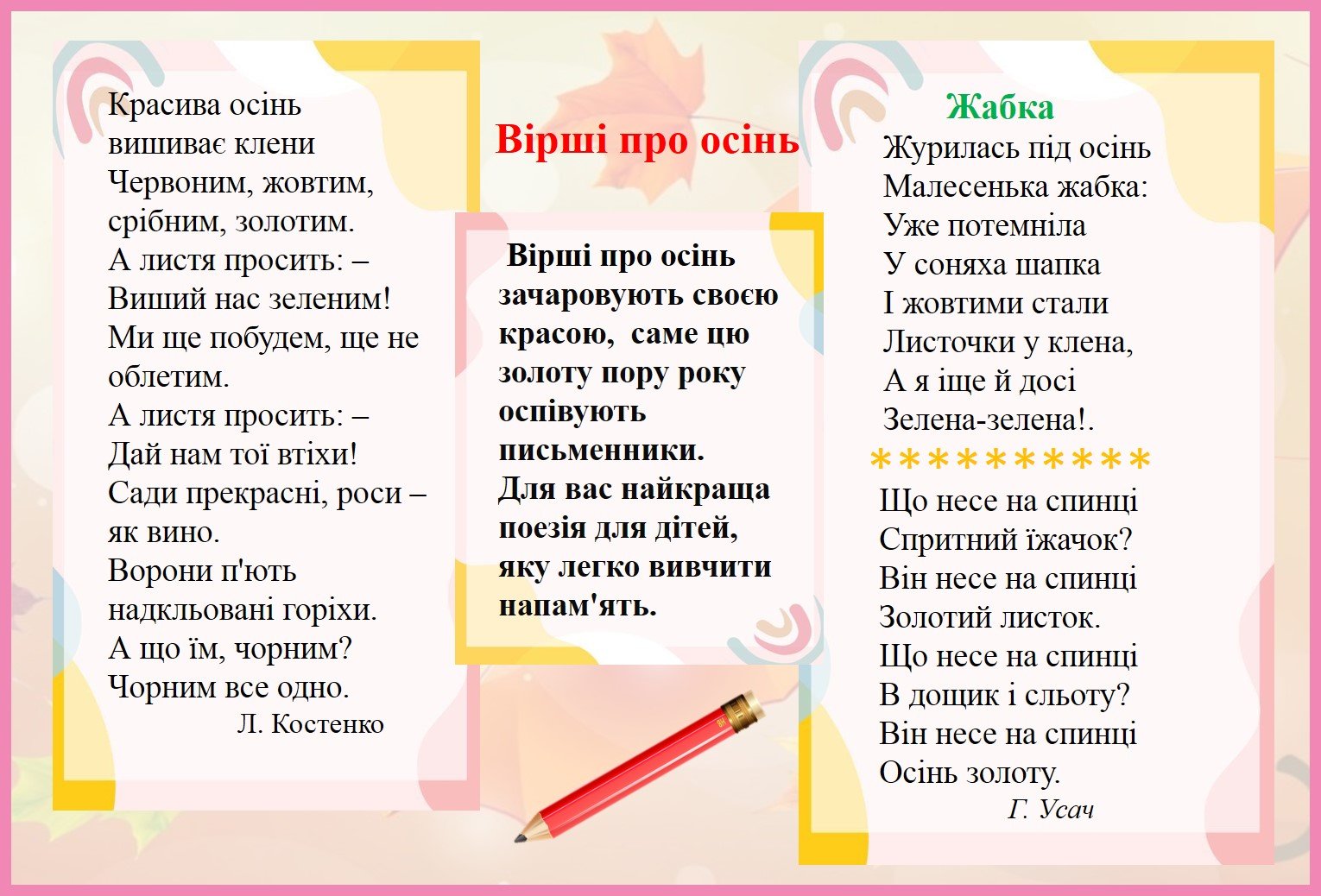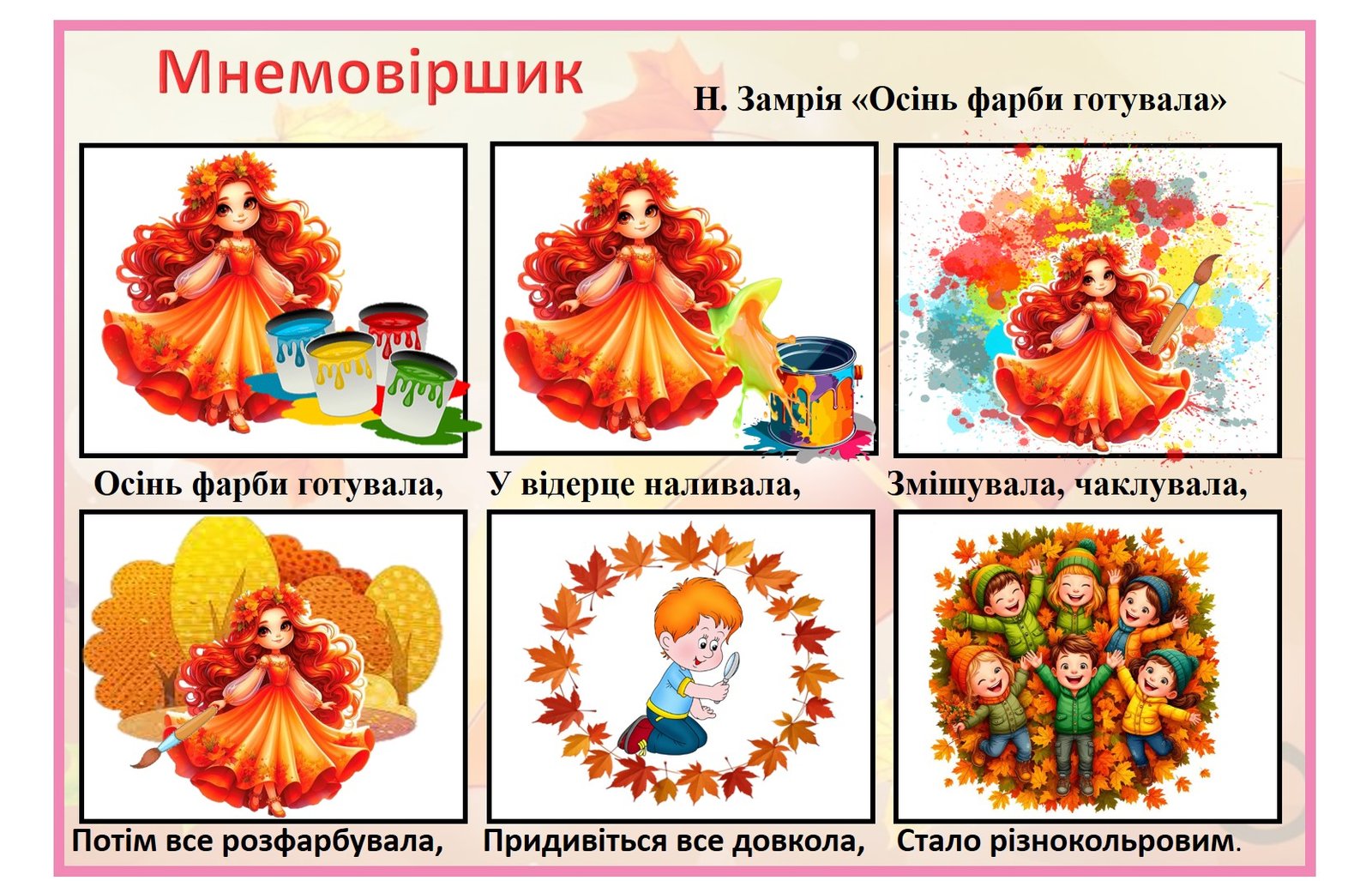 Мета. Розвивати інтерес до художнього слова- віршів, прислів’їв, загадок, мнемовіршів; пам’ять, увагу та творче мислення з поетичними текстами. Збагачувати словниковий запас учнів. Удосконалювати навички виразного читання та мовлення. Формувати естетичне сприймання природи, уміння передавати красу осінніх явищ словами. Виховувати любов до рідної мови, природи та почуття вдячності за її щедрість.