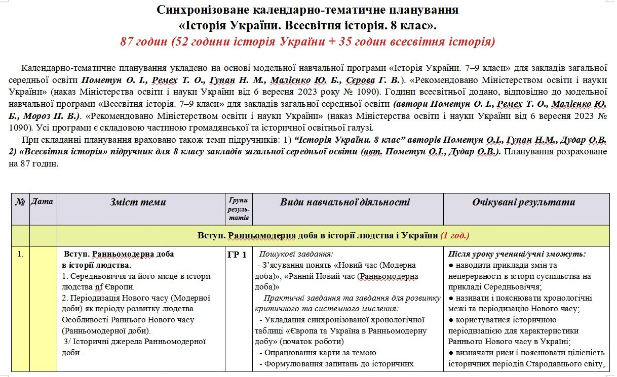 Синхронізоване календарно-тематичне планування «Історія України. Всесвітня історія». 8 клас. 87 г...