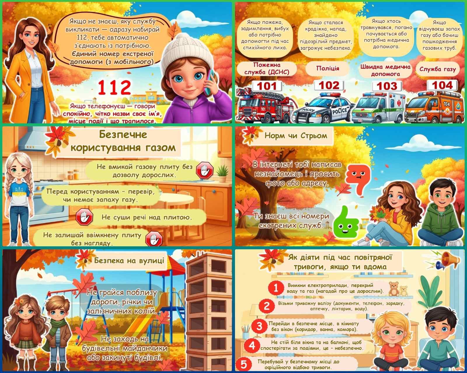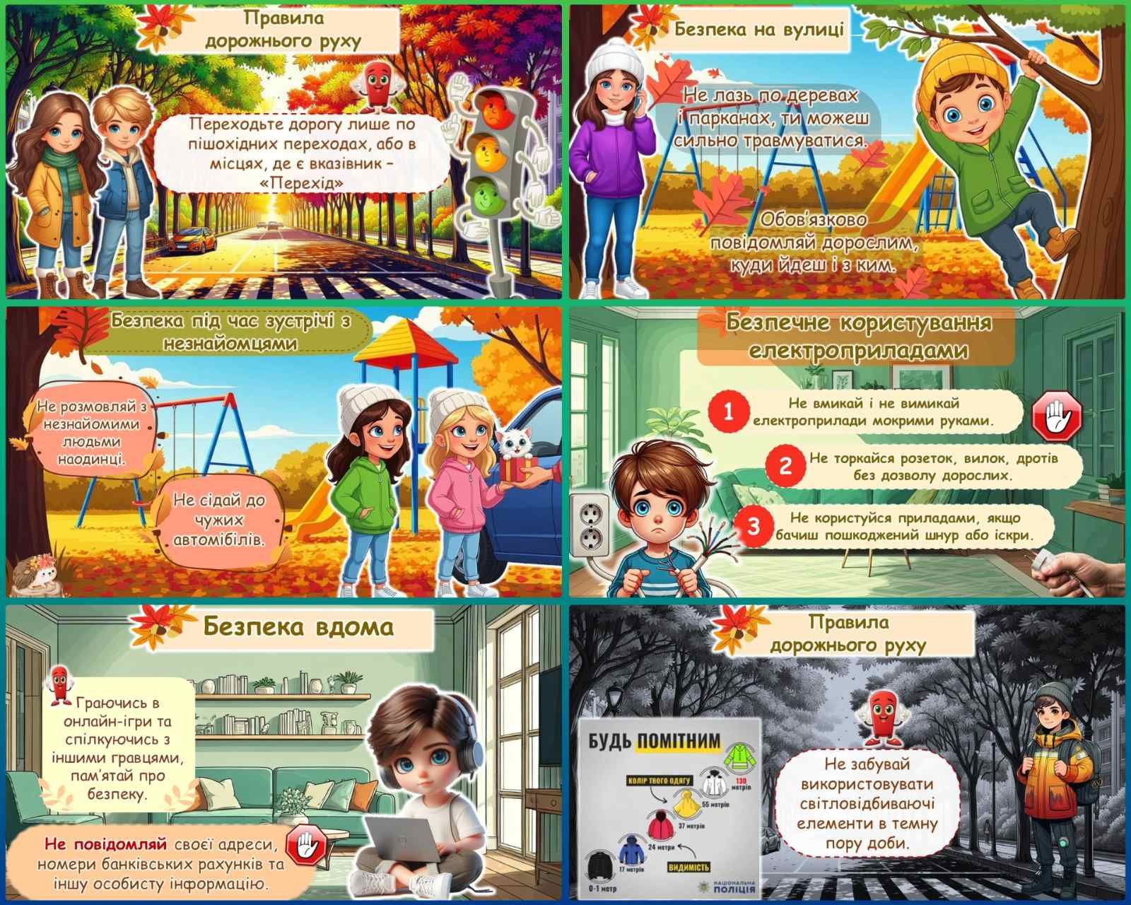 Мета — нагадати дітям про основні правила безпечної поведінки під час відпочинку восени: на дорозі, вдома, на вулиці, під час зустрічі з незнайомцями, при повітряній тривозі чи виявленні небезпечних предметів.