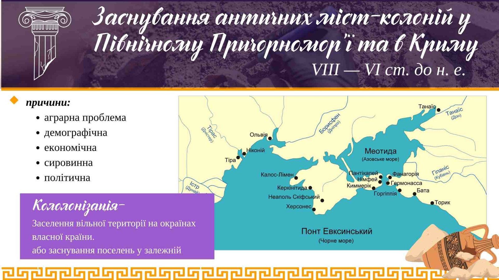 - Заснування античних міст-колоній у Північному Причорномор’ї та в Криму.