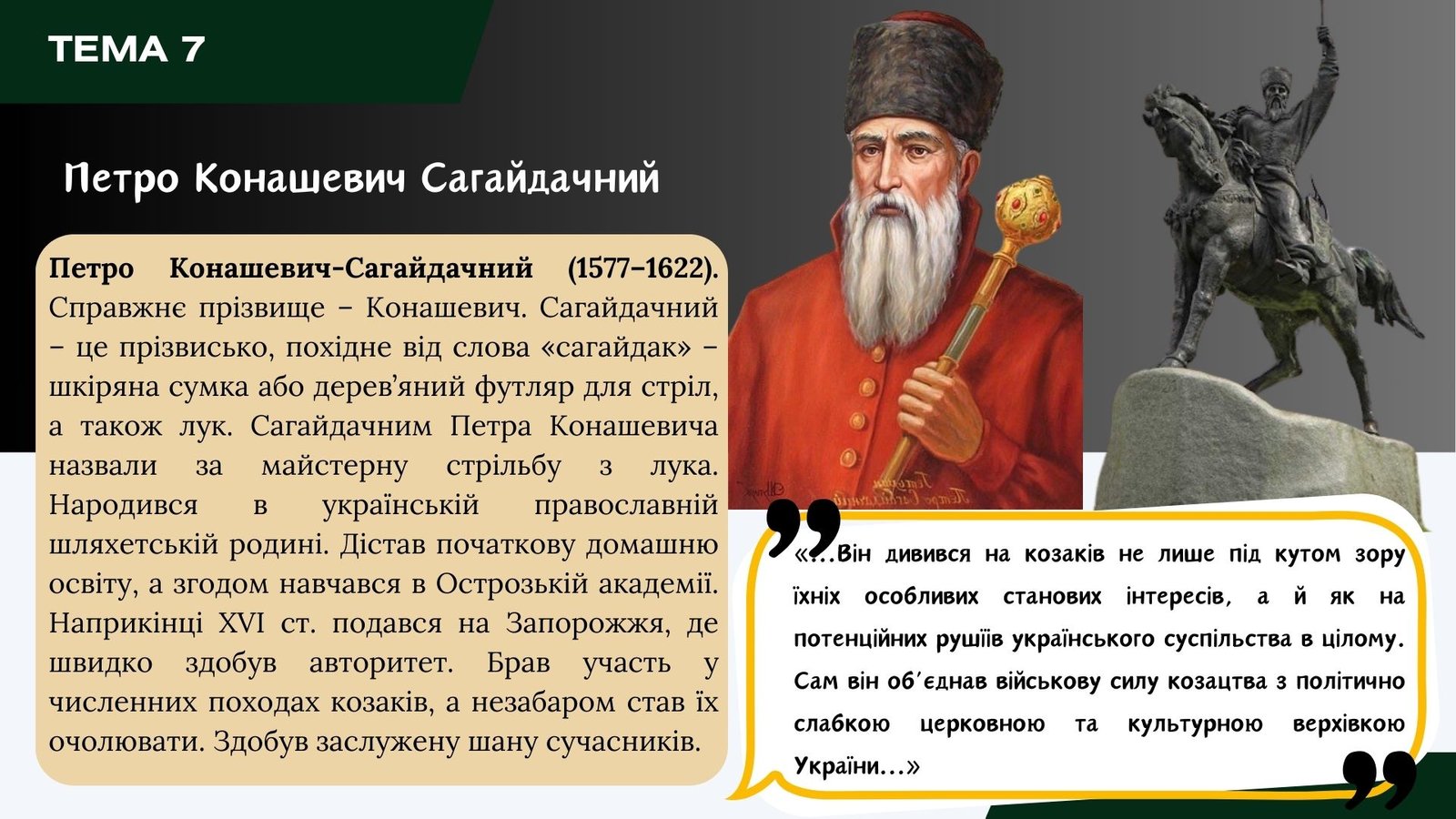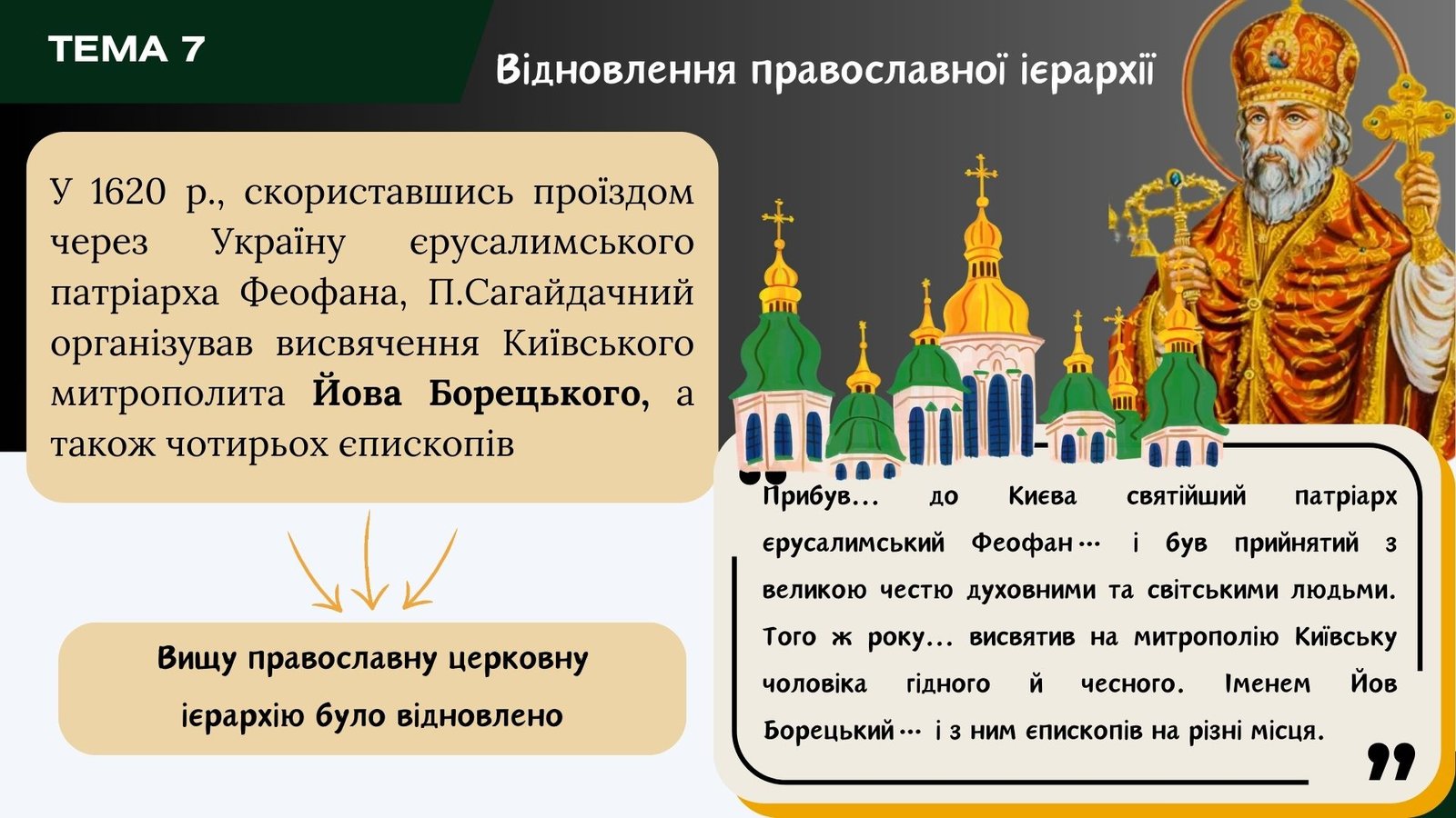 В матеріалі висвітелено питання: Зміни в соціальноекономічному житті. Морські походи козаків. Участь українського козацтва у війнах Речі Посполитої проти Московського царства та Османської імперії. Козацькі повстання 1620-1630-хрр. «Ординація Війська Запорозького…». Культура. Відновлення вищої православної церковної ієрархії 1620 р. Духовність