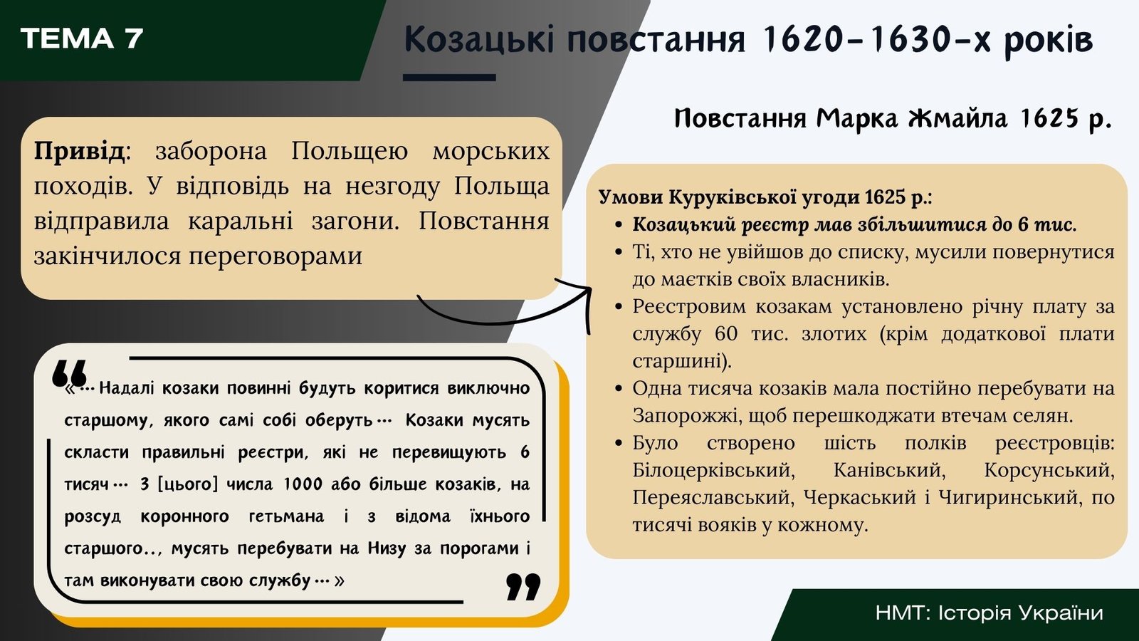 Ні. Всі матеріали, в тому числі «Тема 7. Українські землі у складі Речі Посполитої у першій половині ХVII ст. Історія України НМТ» можна придбати тільки через кошик на сайті.