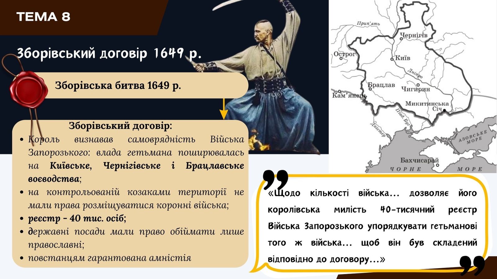 Щоб купити «Тема 8. Національно-визвольна війна середини 17 ст. Презентація для НМТ з історії України», потрібно додати матеріал до кошика та оплатити замовлення.