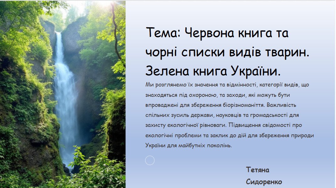 Мета матеріалу: Навчальний ресурс спрямований на формування в учнів уявлення про Червону та Зелену книги України, їхню структуру, значення та роль у збереженні природи. Учні ознайомлюються з причинами зникнення видів, категоріями охоронюваних тварин, а також відмінностями між Червоною книгою та чорними списками.