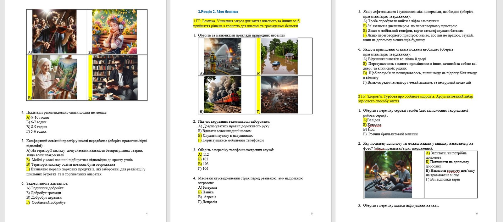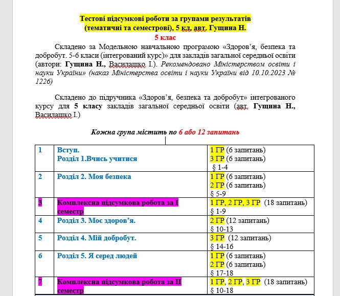 Тестові підсумкові роботи за групами результатів «Здоров’я, безпека та добробут» (авт. Воронцова ...
