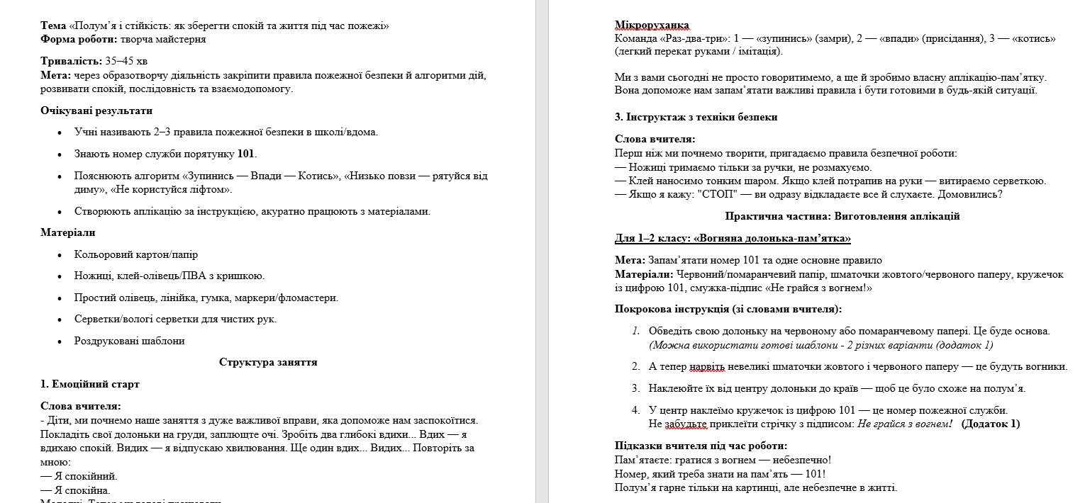 Творча майстерня «Полум’я і стійкість: як зберегти спокій та життя під час пожежі» — це інтерактивне заняття для учнів 1–4 класів, яке поєднує бесіду та аплікацію. Діти знайомляться з основними правилами пожежної безпеки, закріплюють алгоритми дій у разі небезпеки, вчаться залишатися спокійними, а також створюють власну вогняну долоньку (1–2 кл.) або щит пожежної безпеки та квітку-пам’ятку (3–4 кл.).
