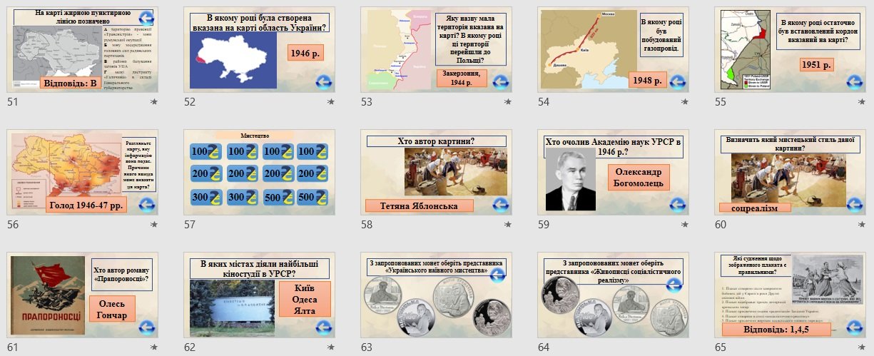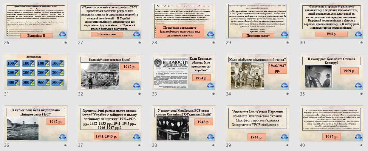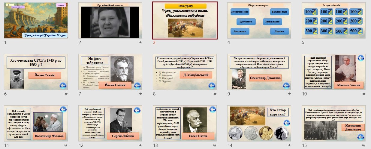 Урок узагальнення з теми: “Післявоєнна відбудова” історія України 11 клас. Розробка містить конспект та інтерактивну гру в вигляді презентації за мате