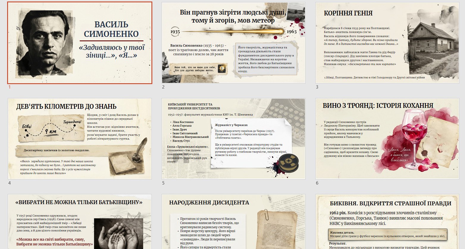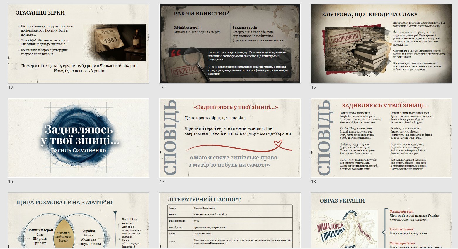 Презентація допомагає провести цілісний, емоційно насичений і водночас аналітичний урок про поета-шістдесятника та два його знакові твори. Матеріал поєднує біографічний контекст (становлення світогляду, громадянська позиція, дисидентський рух, трагічні обставини життя) та ґрунтовний літературний аналіз поезій.