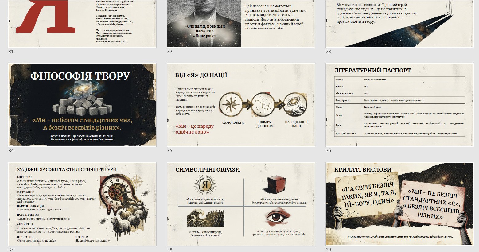 - робота з текстом «Я…»: конфлікт особистості й системи (“він” проти “мене”), мотив гідності та унікальності людини, літературний паспорт, формула “безліч всесвітів різних”, перехід від “я” до нації;