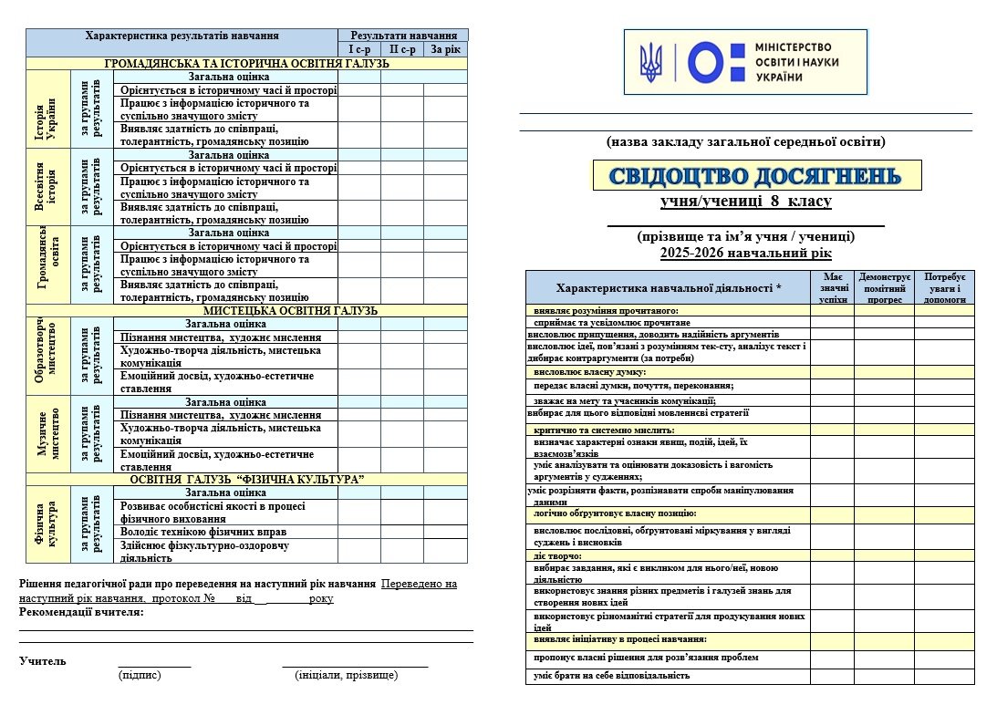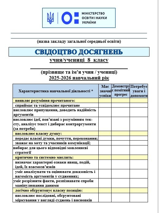 СВІДОЦТВО ДОСЯГНЕНЬ УЧНІВ 8 КЛАСУ НУШ. 1 іноземна мова + курси за вибором