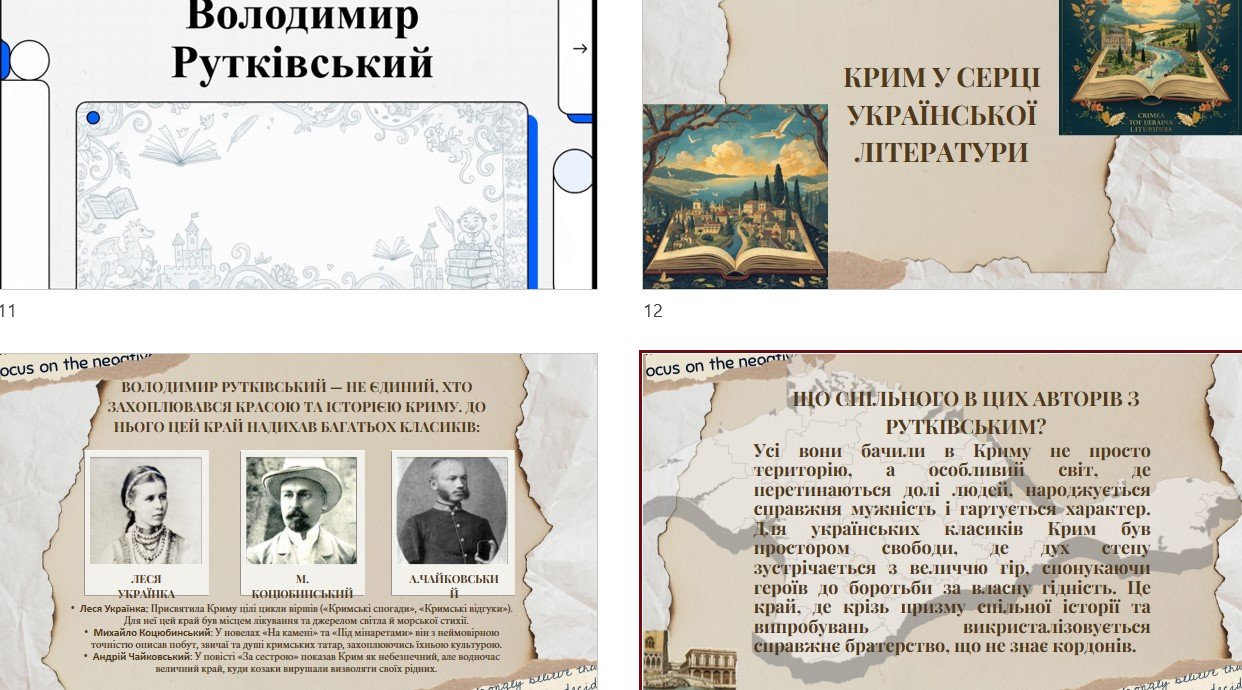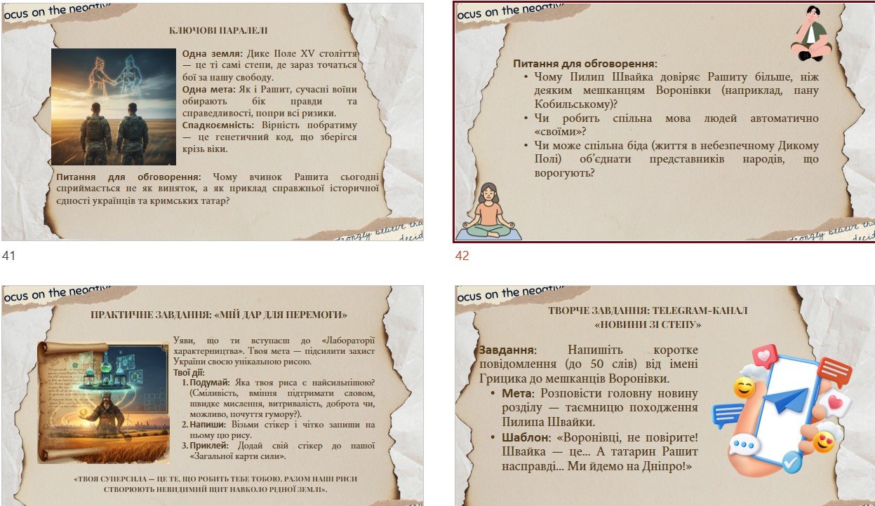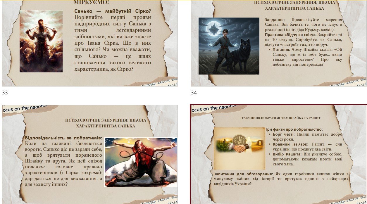✅ WOW-хук (емоційний та захопливий початок уроку (коротке відео, що пов’язує сиву давнину із сучасністю); мета та очікувані результати уроку; КРИГОЛАМ “Валіза в дикий степ”; актуалізація опорних знань (хто такий “джура” простими словами – можна перейти за посиланням на сторінку вікіпедії, додаткова інформація на слайді, пригадування героїв твору за матеріалами 6 класу); про письменника (відеоогляд життєвого та творчого шляху, представлений у доступній та цікавій формі); Крим у серці української літератури (твори про Крим українських класиків); історичний контекст (умови зародження козацтва); занурення в контекст (інфографіка “Сюжетний ланцюжок”, композиція та паспорт твору); «Чужі, що стали своїми: Уроки людяності в серці Степу» (інтерактивне дослідження розділу “Пастух Рашит” (географія пригод, “Степовий привид” – емоційний вхід у роботу над текстом), дослідження “Свій серед чужих”, вправа “Сакви Швайки”, робота з ШІ, інфографіка “Надлюди Запорозької Січі, коротке відео про походження козаків-характерників, психологічне занурення “Школа характерництва Санька” (зв’язок із раніше вивченим твором “Іван Сірко – великий характерник”), таємниця побратимства; коротке відео “Погляд сучасника – хто друг, а хто ворог”; герої крізь віки – від Швайки до сучасників; практичні та творчі завдання, вправа “Діалог без слів”; рефлексія “Золота скриня уроку”; диференційоване домашнє завдання “Спадкоємці характерників”.