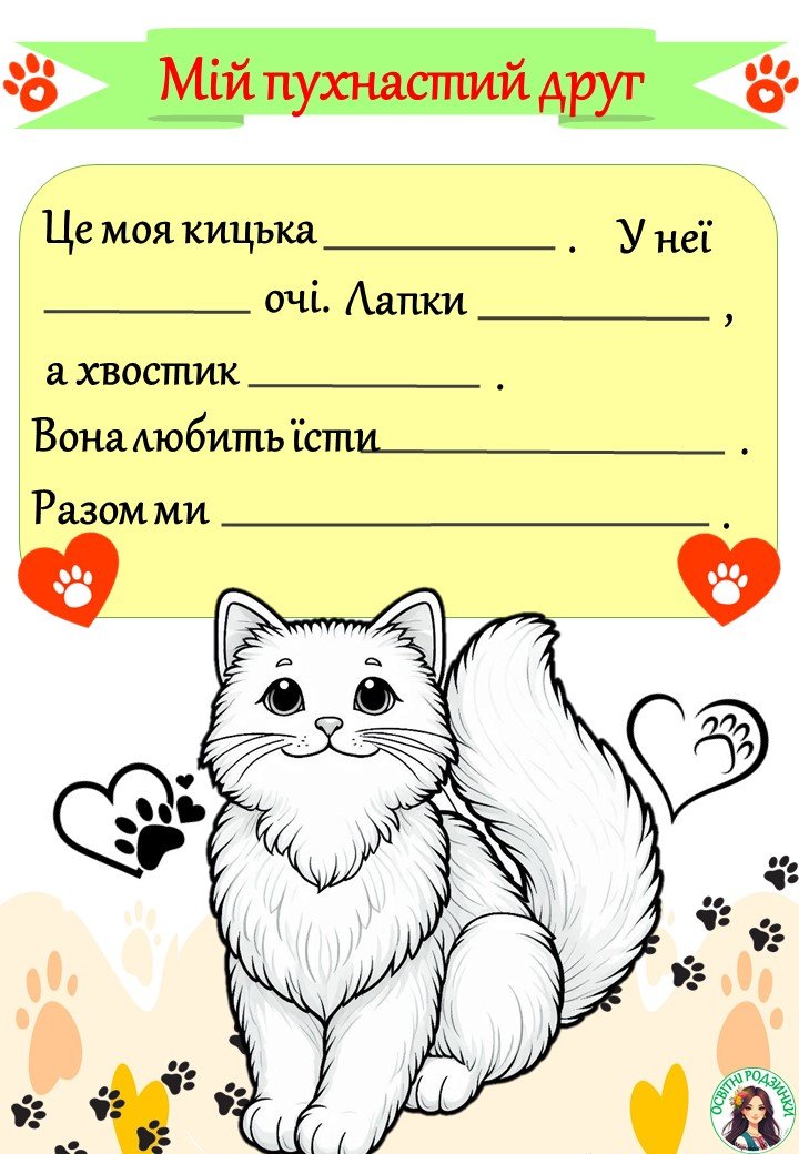 Запиши, розфарбуй, розкажи. Учні мають записати слова, яких не вистачає про свою тваринку, розфарбувати її та розповісти класу про неї. Всього 14 карток, формату А4.