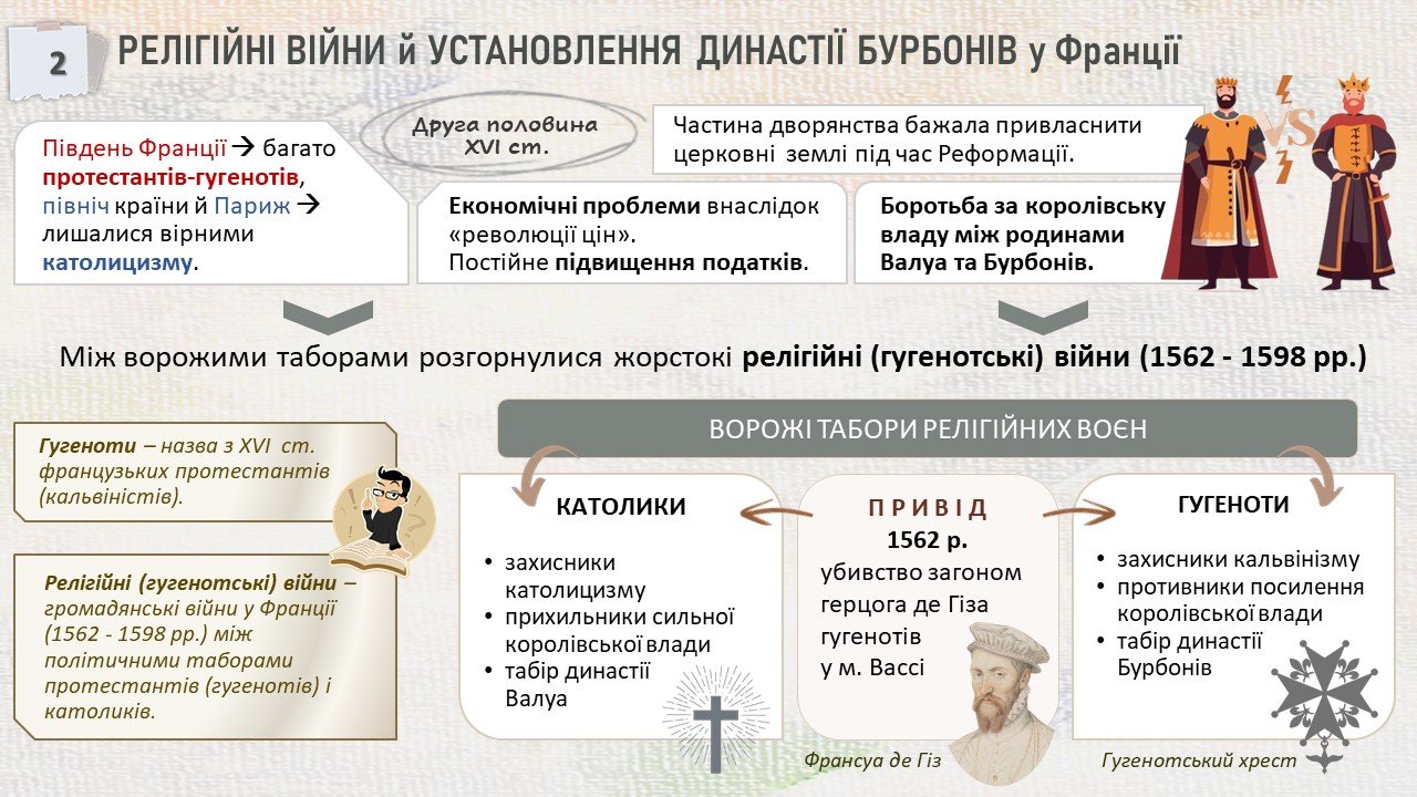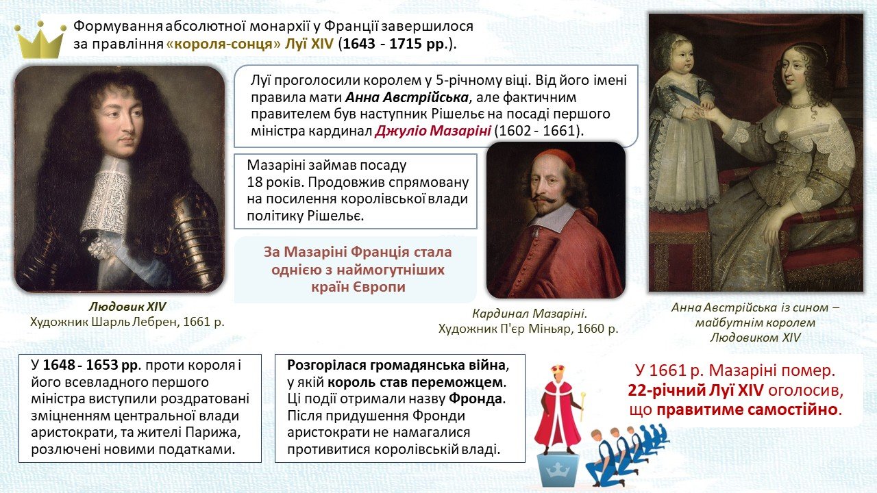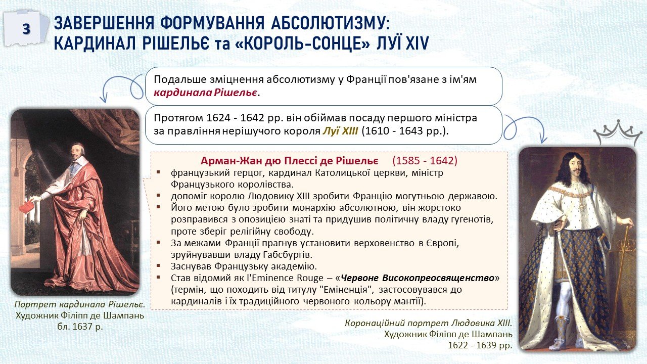 Презентація «Абсолютні монархії. Становлення абсолютної монархії у Франції та Пруссії» може використовуватися як для проведення уроку у дистанційному чи офлайн форматі, так і для самостійного опрацювання теми уроку здобувачами освіти. Матеріал містить анімації, тематичні зображення, різноманітні завдання і розкриває такі питання: 1) Королівська влада в першій половині XVI ст.; 2) Релігійні війни й установлення династії Бурбонів у Франції; 3) Завершення формування абсолютизму: кардинал Рішельє та «король-сонце» Луї XIV; 4) Бранденбург-Пруссія у XVI – XVII ст.