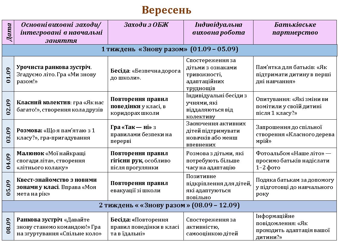 Календарний план навчально-виховної роботи ГПД на І семестр 2025-2026 н.р. (молодші класи)